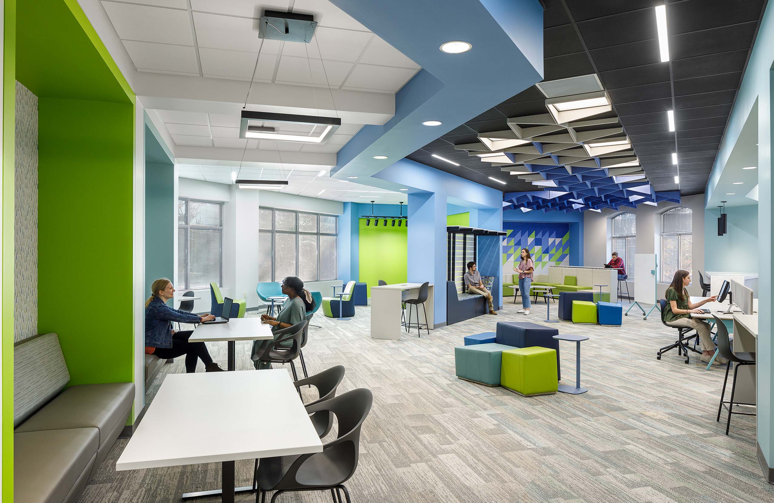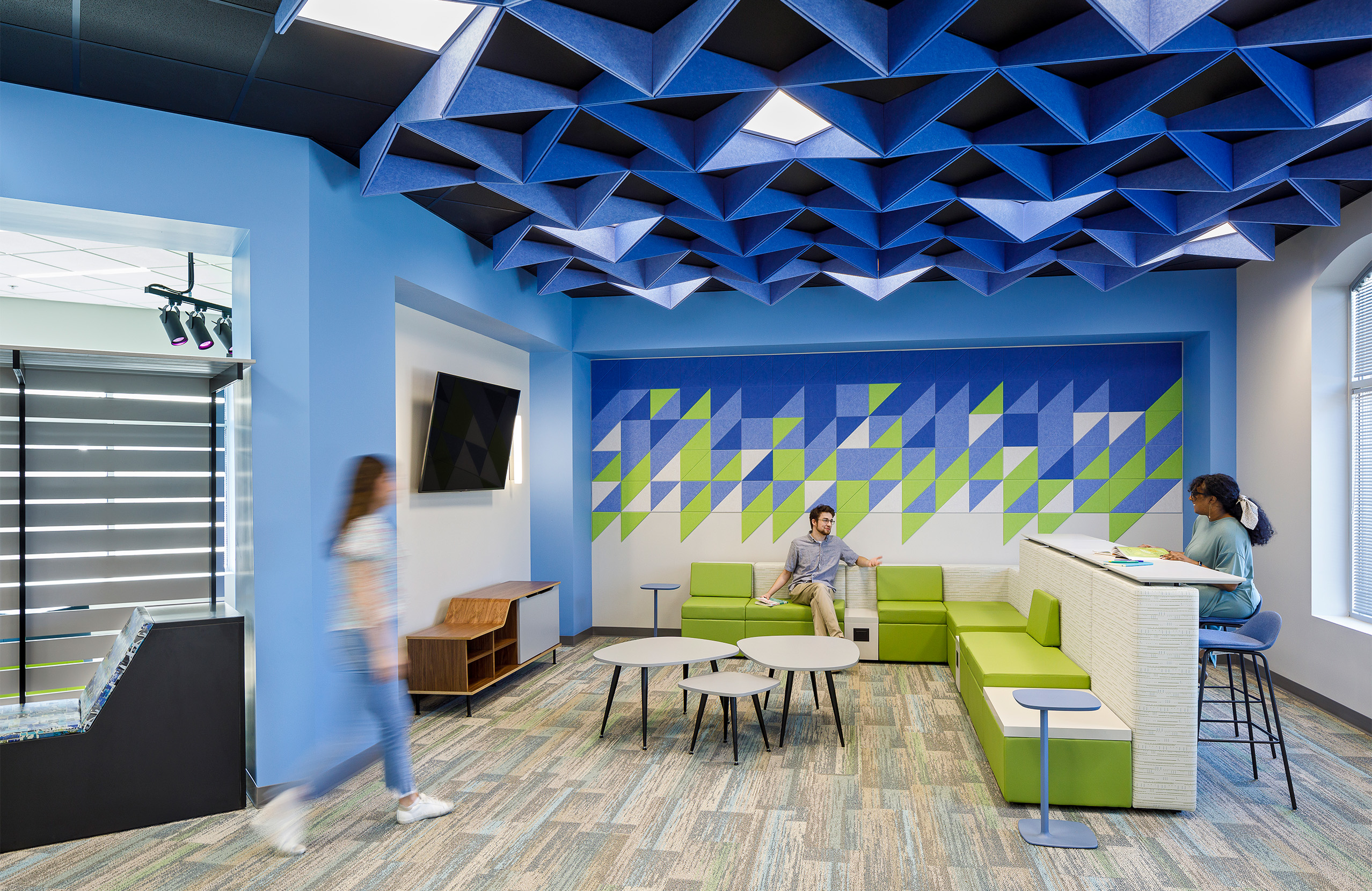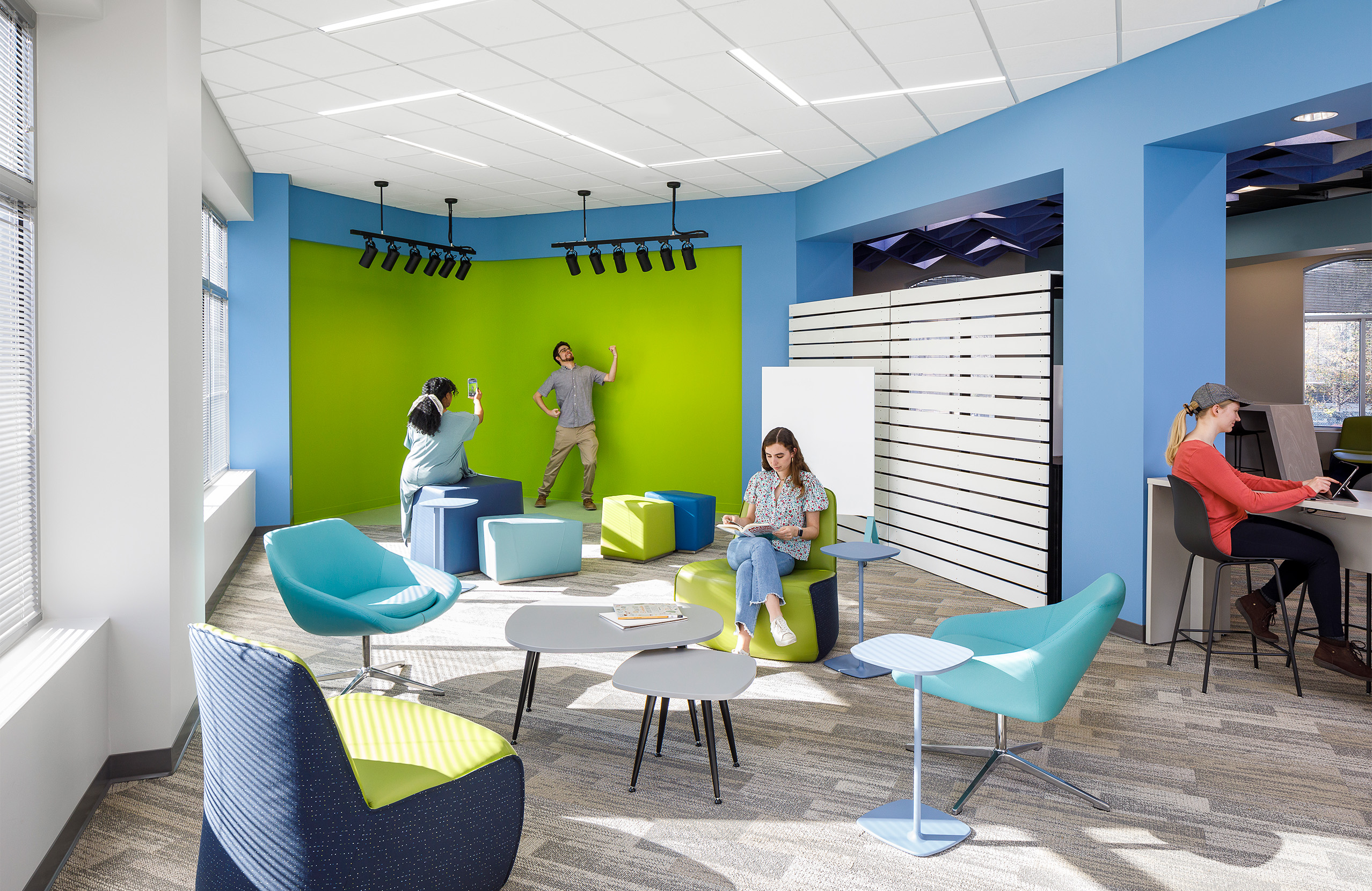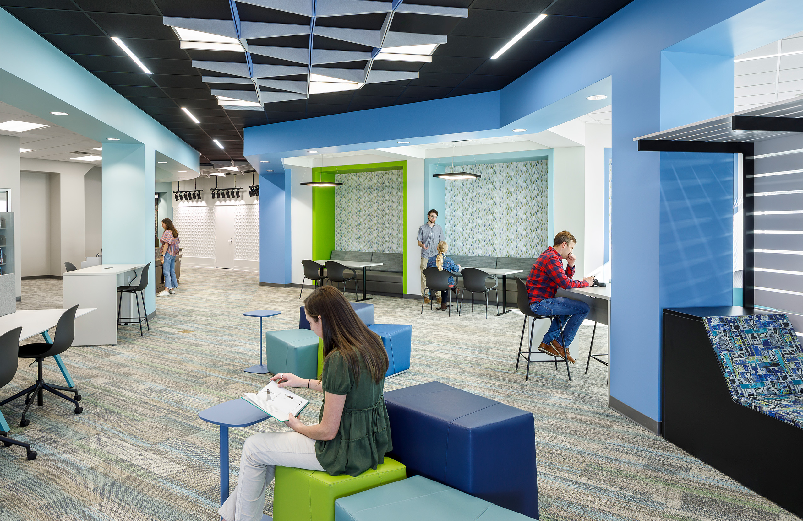 Located in an Atlanta suburb, the Nancy Guinn Memorial Library, originally built in 1989, lacked a dedicated space to support the needs of their young adult population. The library challenged the design team to create an inviting, energized, destination space for teens. After assessing the current space utilization and programmatic goals, an awkwardly shaped, poorly lit corner of the library was chosen as the canvas. Within the constraints of the existing structure, new angular bulkheads define spatial zones, create a sense of progression, and provide visual interest in the ceiling plane. Expanding and constricting, the bulkheads work in tandem to provide order to the irregularly shaped space while allowing the floor plane to remain unobstructed. The minimal use of walls allows for views of the park from any location. As bulkheads engage with vertical elements the color spills down from the ceiling to create dimension within the volume. Ceiling baffles enhance the acoustic quality while the increasing saturation and density of the elements guide patrons to the living room. Study niches and a canopy lounge create personal scale within the open area. Intentionally flexible furniture solutions, sprinkled in saturated blue and green hues, can shift within the space to support a variety of functions as needs change throughout the day. The green screen facilitates content creation but can also serve as general lounge seating when recording is not taking place. From a variety of postures available, the users can choose the setting that best supports their goals for the visit