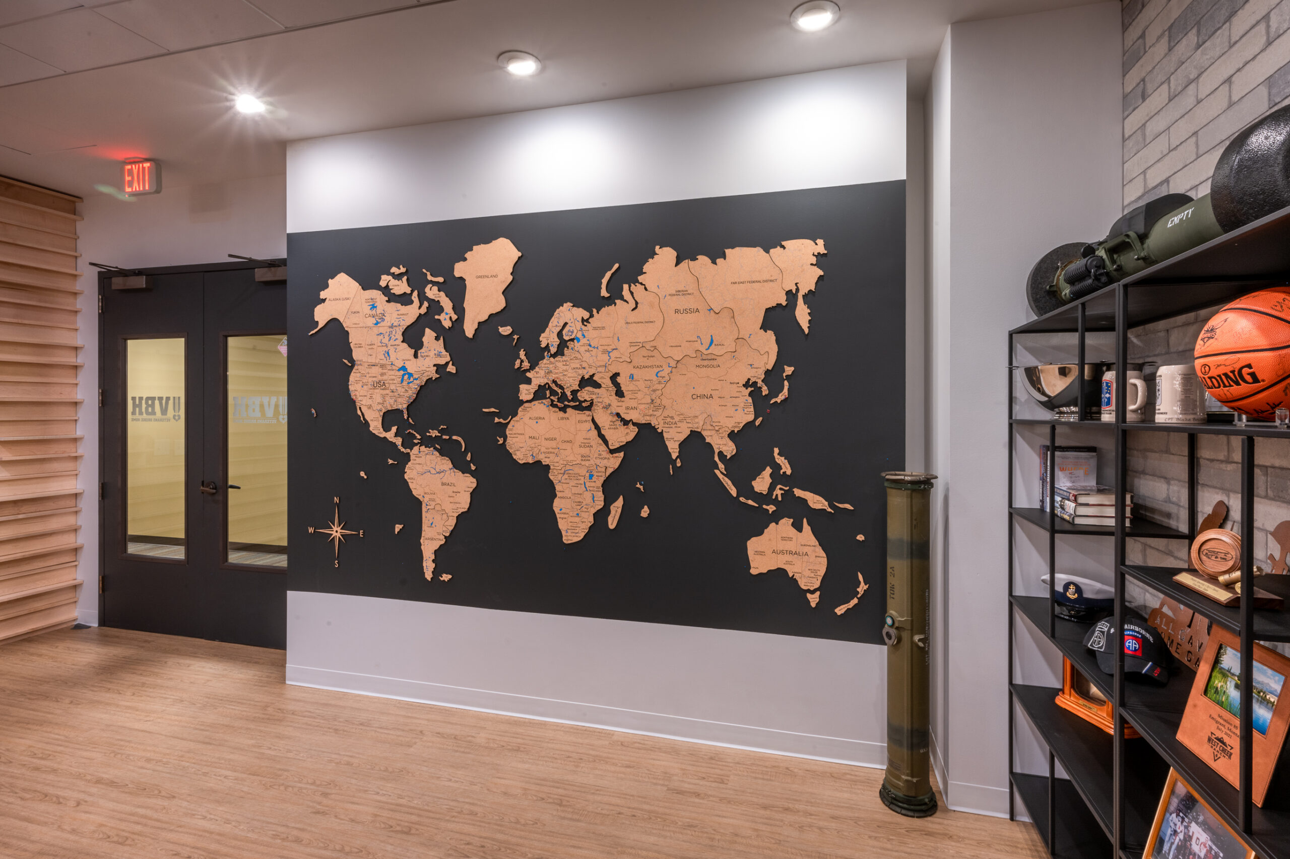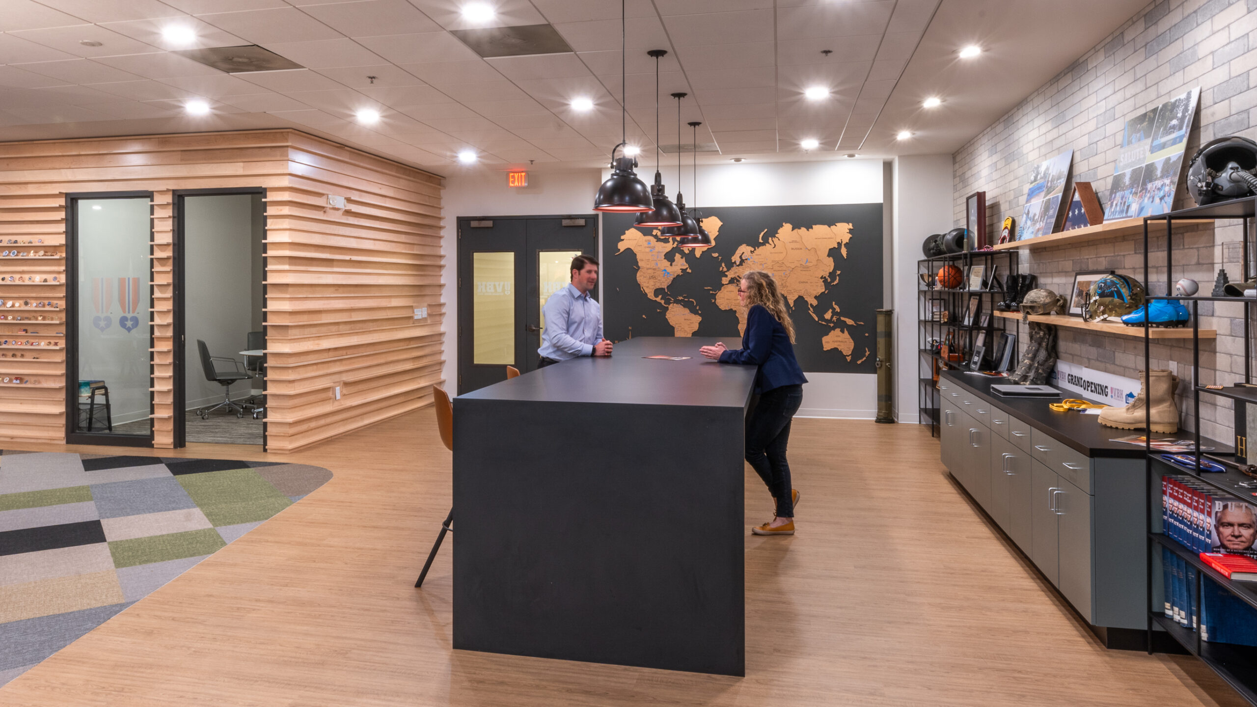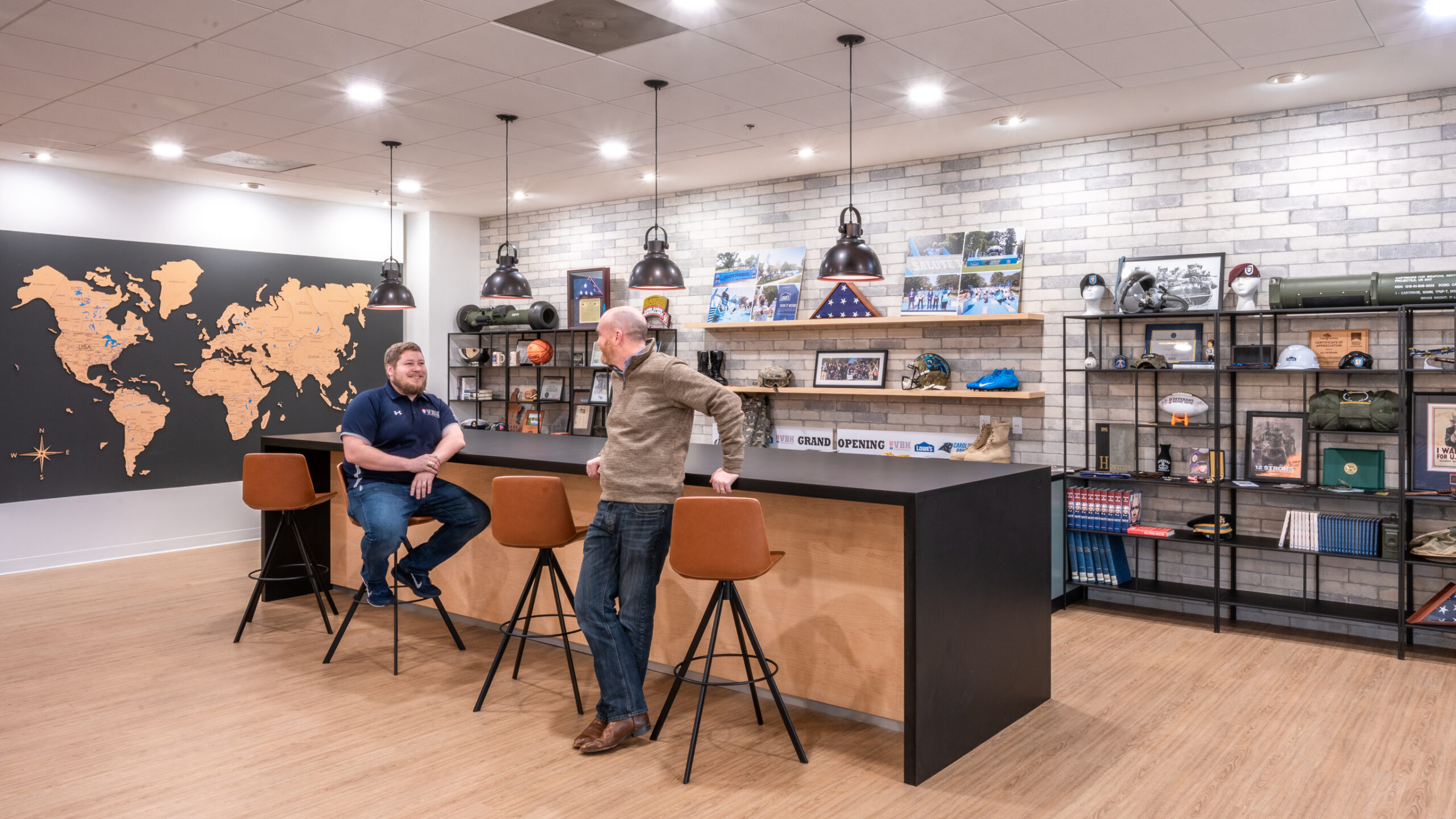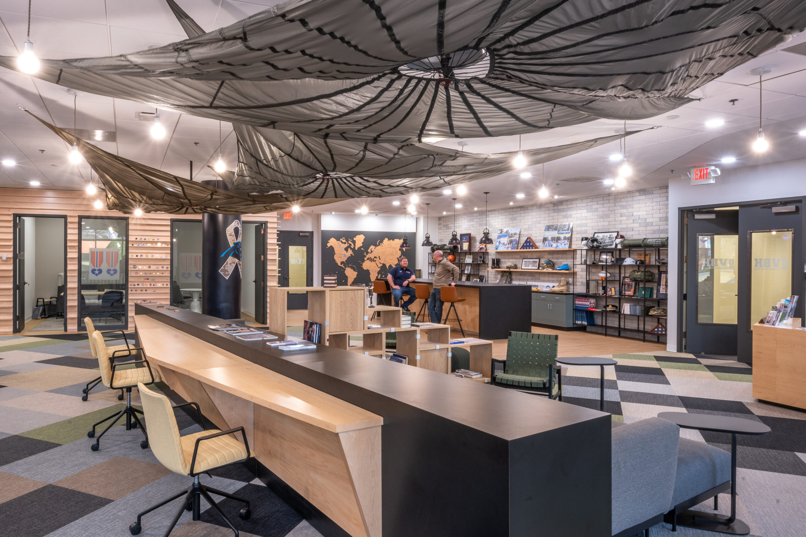 Design elements within the space include a millwork wall inspired by military challenge coin displays, a ceiling feature using veteran donated parachutes, and “conversation walls” hosting cherished artifacts and an interactive map where veterans can pin their service locations. Careful consideration was taken to ensure the design solution would help ease the transition from Military to Civilian life.