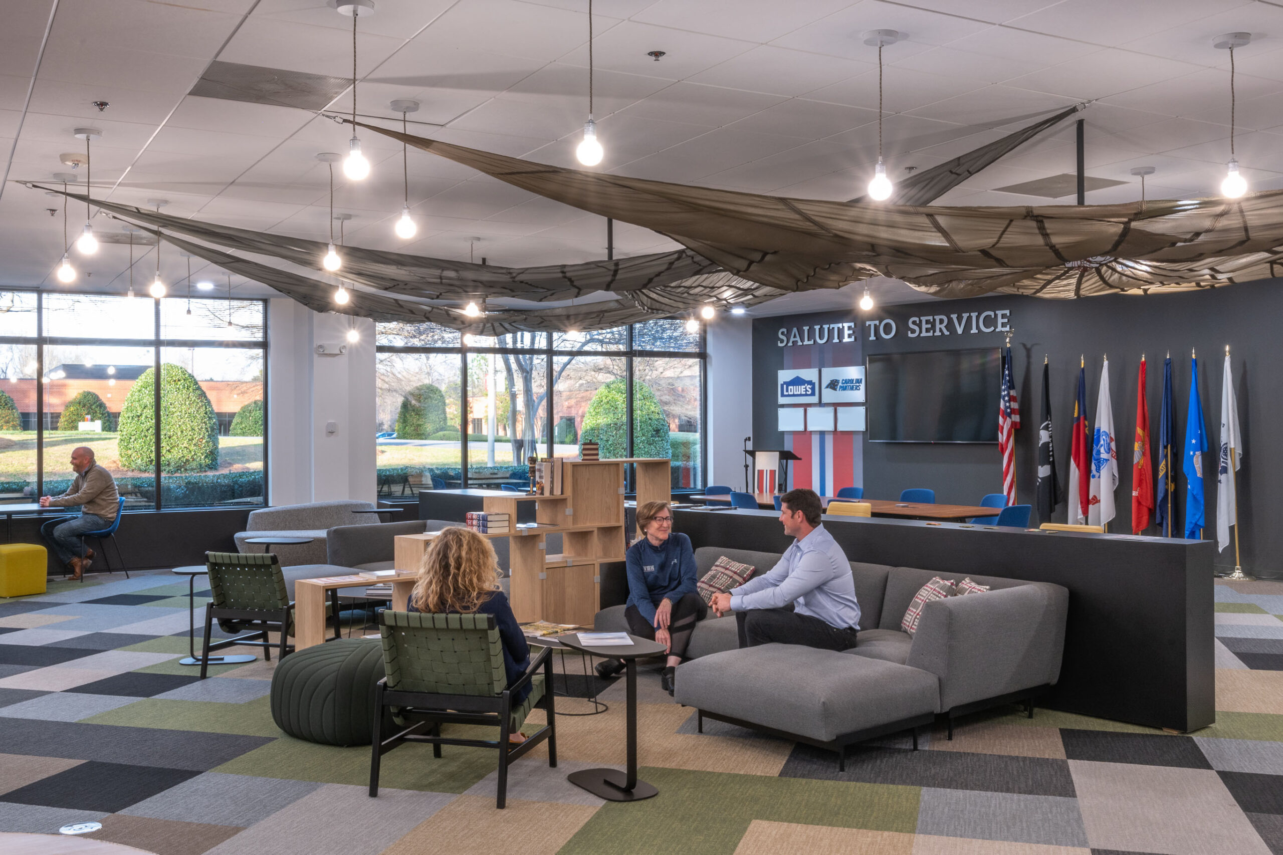 An incredible partnership between Lowe’s Home Improvement, Carolina Panthers, GC, Design Firm, and Furniture Dealer resulted in the completion of VBH’s Salute to Service Lounge. Through supply donations, resourceful uses of materials, and creative solutions, the project construction, which was budgeted at $250,000 was delivered for $100,000. The space was built with as many veterans as possible, including 35% of the onsite workers as well as veteran-owned millwork, signage, and carpet vendors.