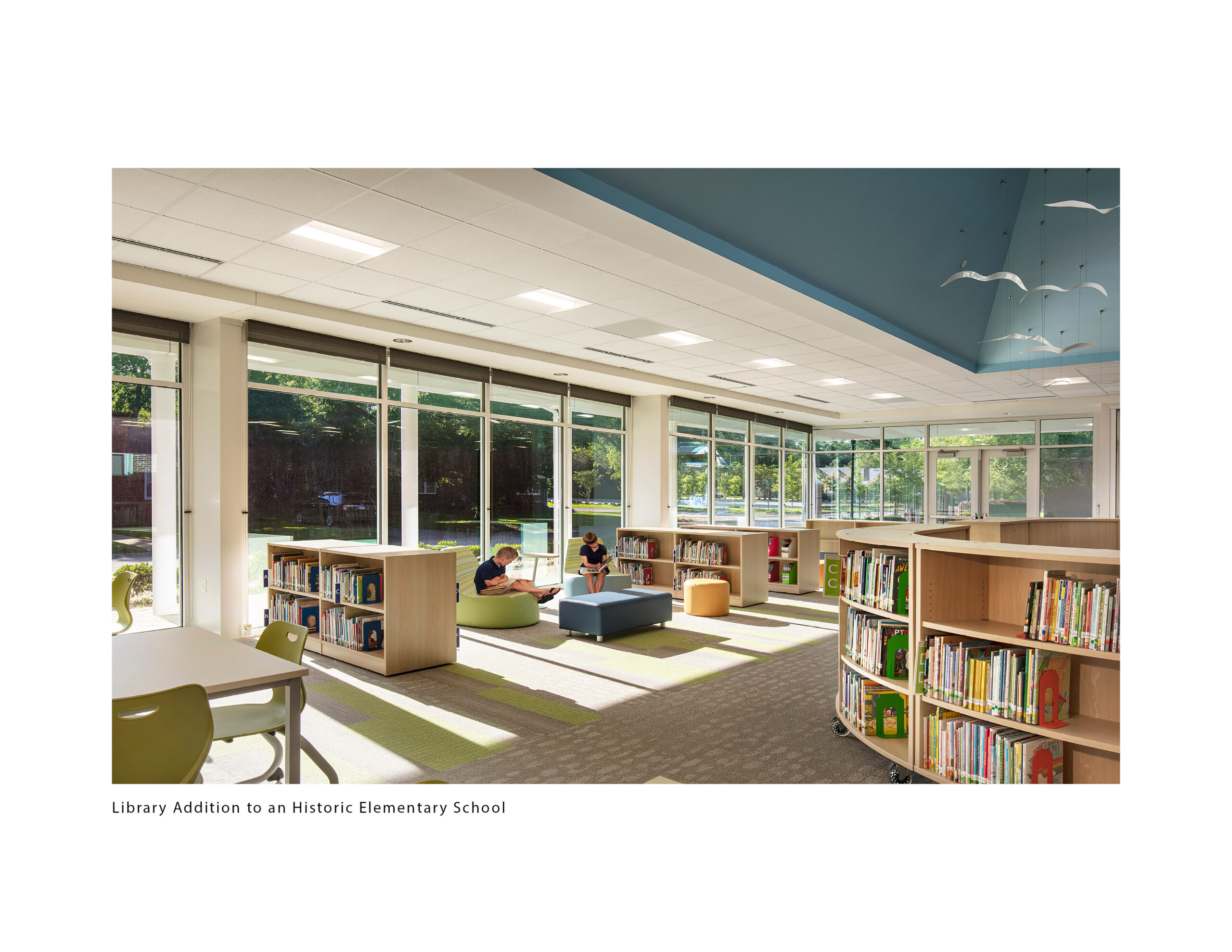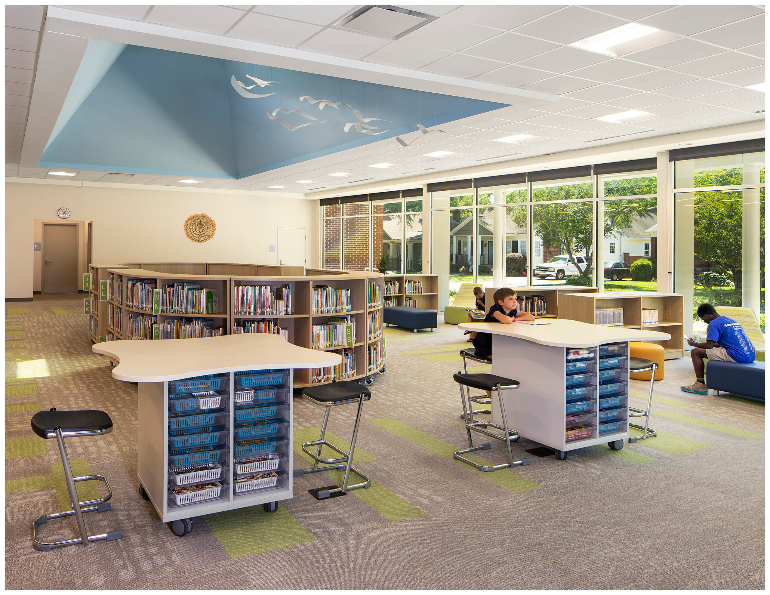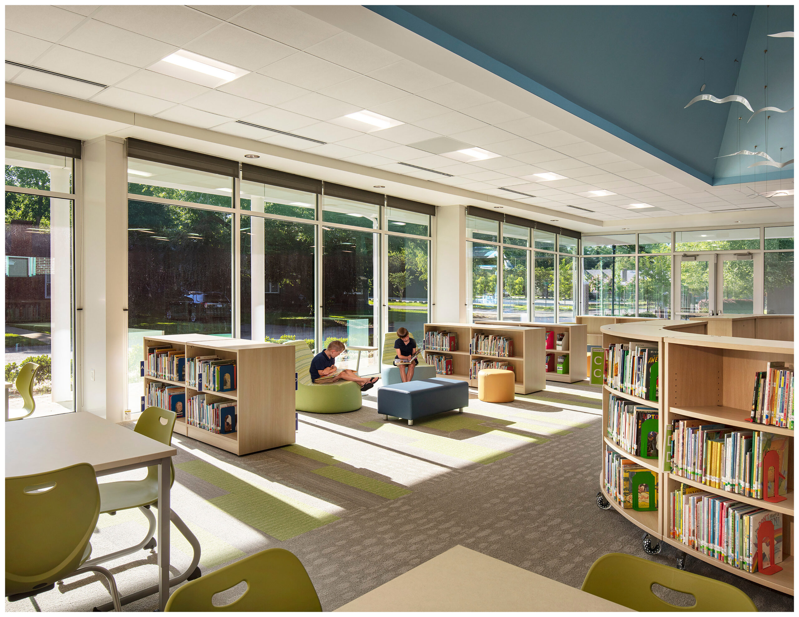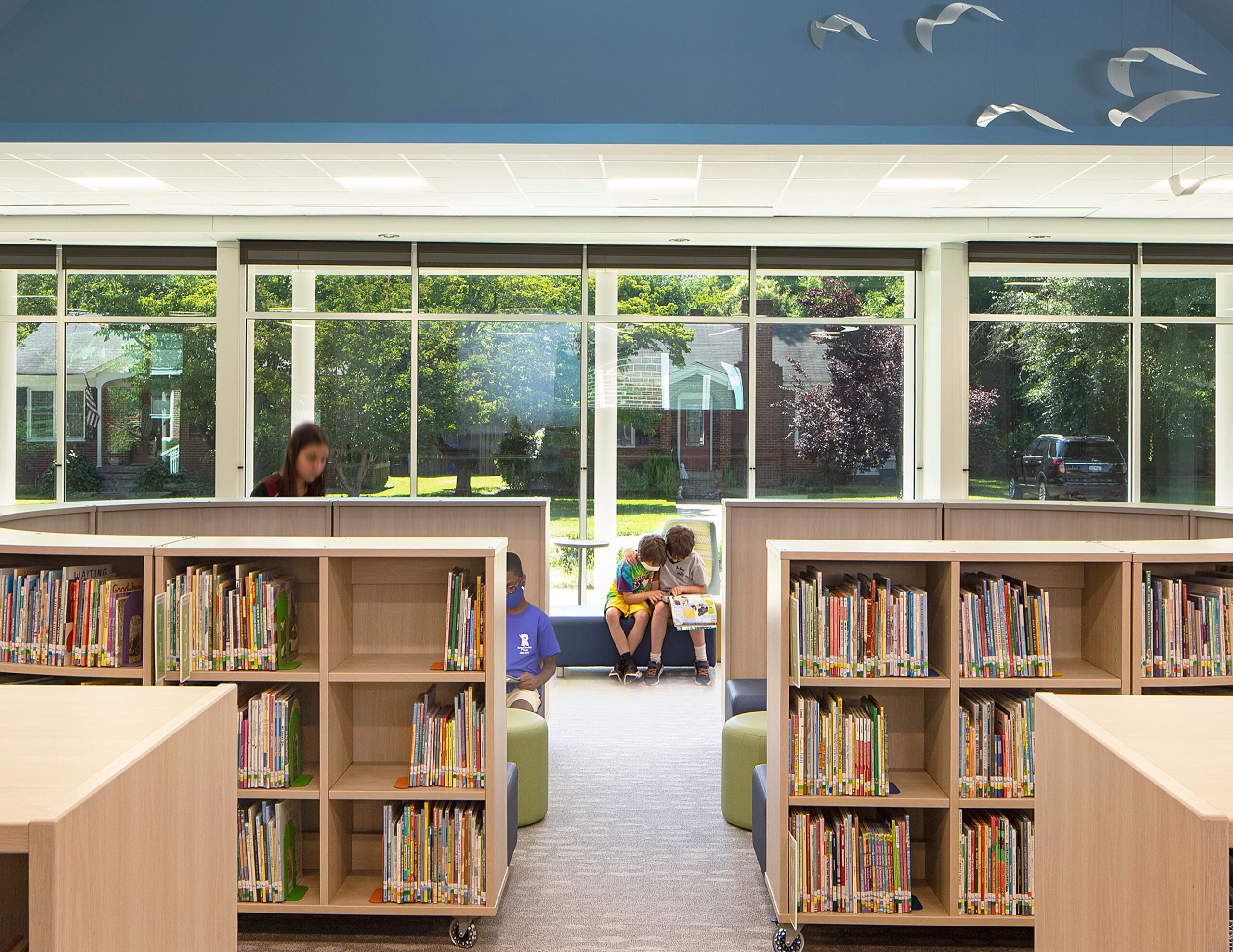 First constructed in the 1930’s, Rosewood Elementary School sought a reimagined library to support a broader range of individual and collaborative activities. With inadequate space available within the existing school, plans for a new library addition were developed, with an emphasis on these design strategies to foster learning and academic success: Allow Collaboration: The design provides open, comfortable spaces with soft seating and flexible furnishings to encourage spontaneous, enabled learning. Enable Customization: The reading room is organized into zones that support varying group sizes and activities, from individual study to one-on-one coaching or small group collaboration, and even multi-class assembly. Plan for Flexibility, Mobility, and Agility: The flexibility of the plan and furnishings not only provides customization in the moment, but also sets the stage for evolution over time. Maximize Comfort: In addition to soft seating, the comfort of the space is optimized in terms of daylighting, views outdoors, acoustics, and air quality. A soothing color-palette of blues, greens, and neutrals promotes calm and contemplation. Adapt to Technology: Wired and wireless infrastructure allows anytime/anywhere access, not only planning for the needs of today, but also preparing for the needs of tomorrow. A final charge to the design team was to create a space that stimulates the imagination of a child. By using colors seen in nature, creating a cozy “bird nest” between two curving bookshelves, keeping the interiors scaled for children, and providing a dramatic sculpture of birds in flight ascending into the lightwell, this space does just that.