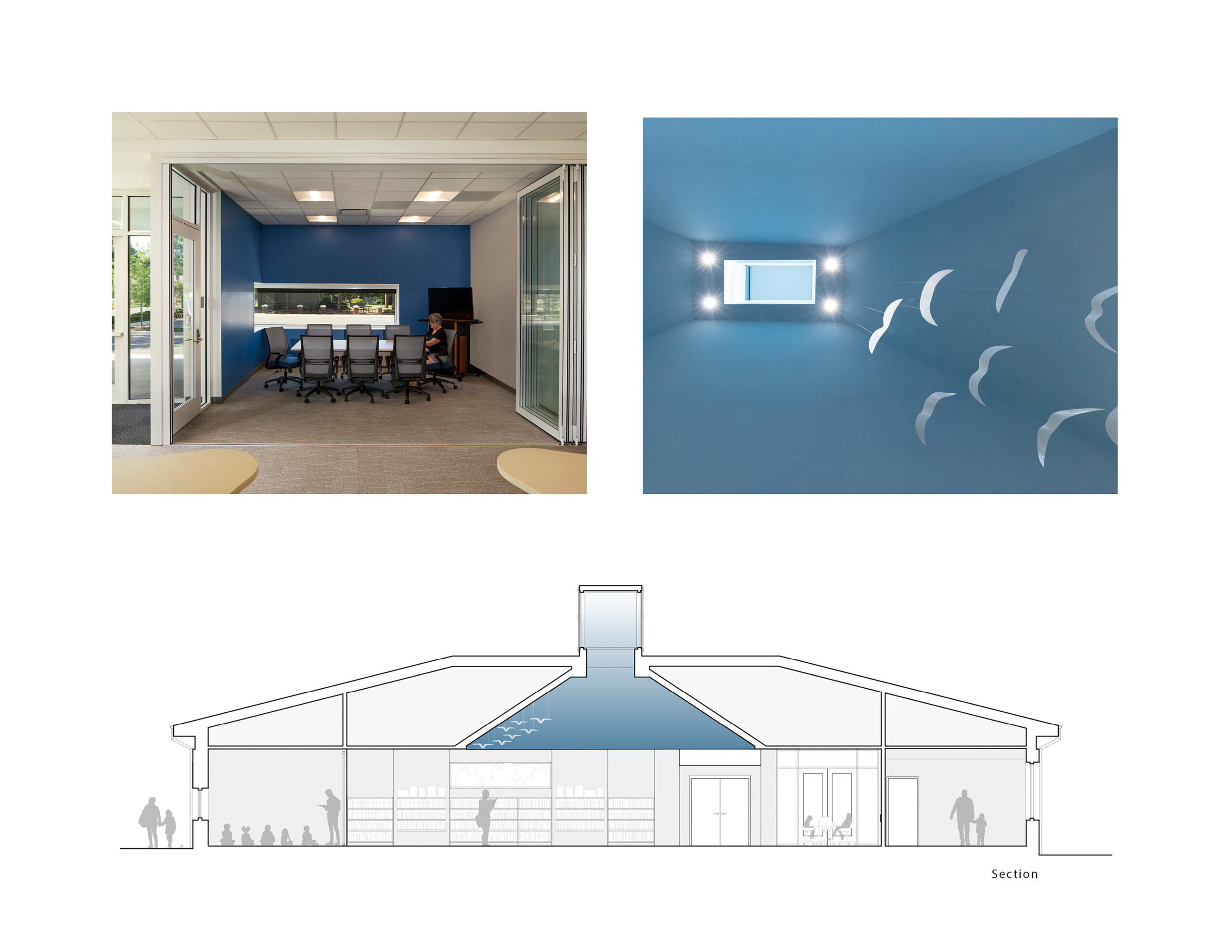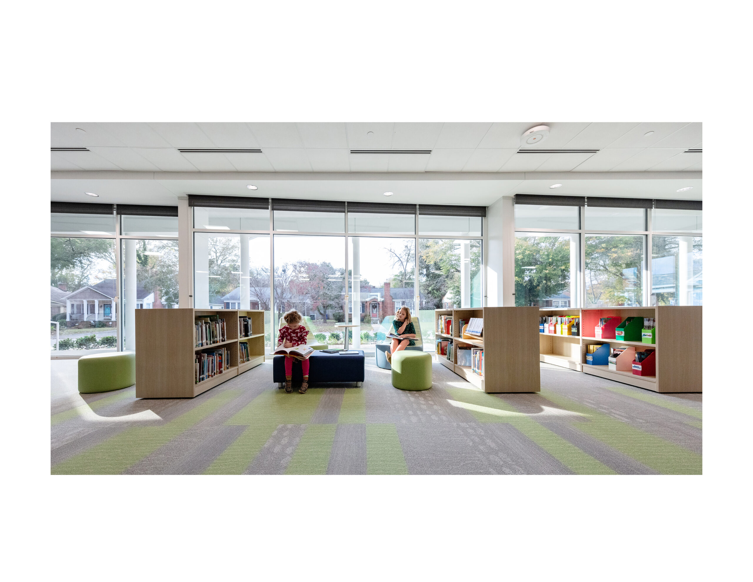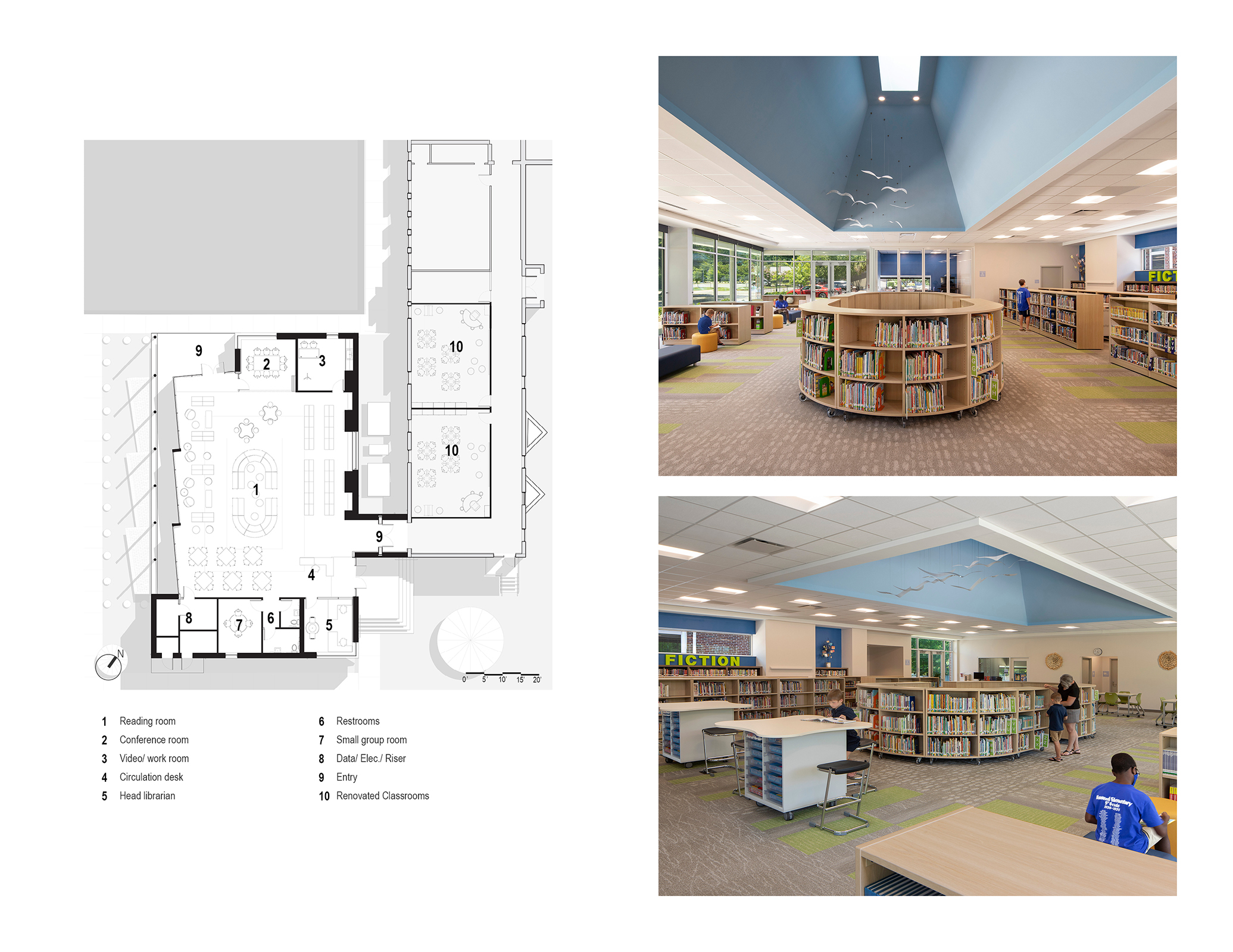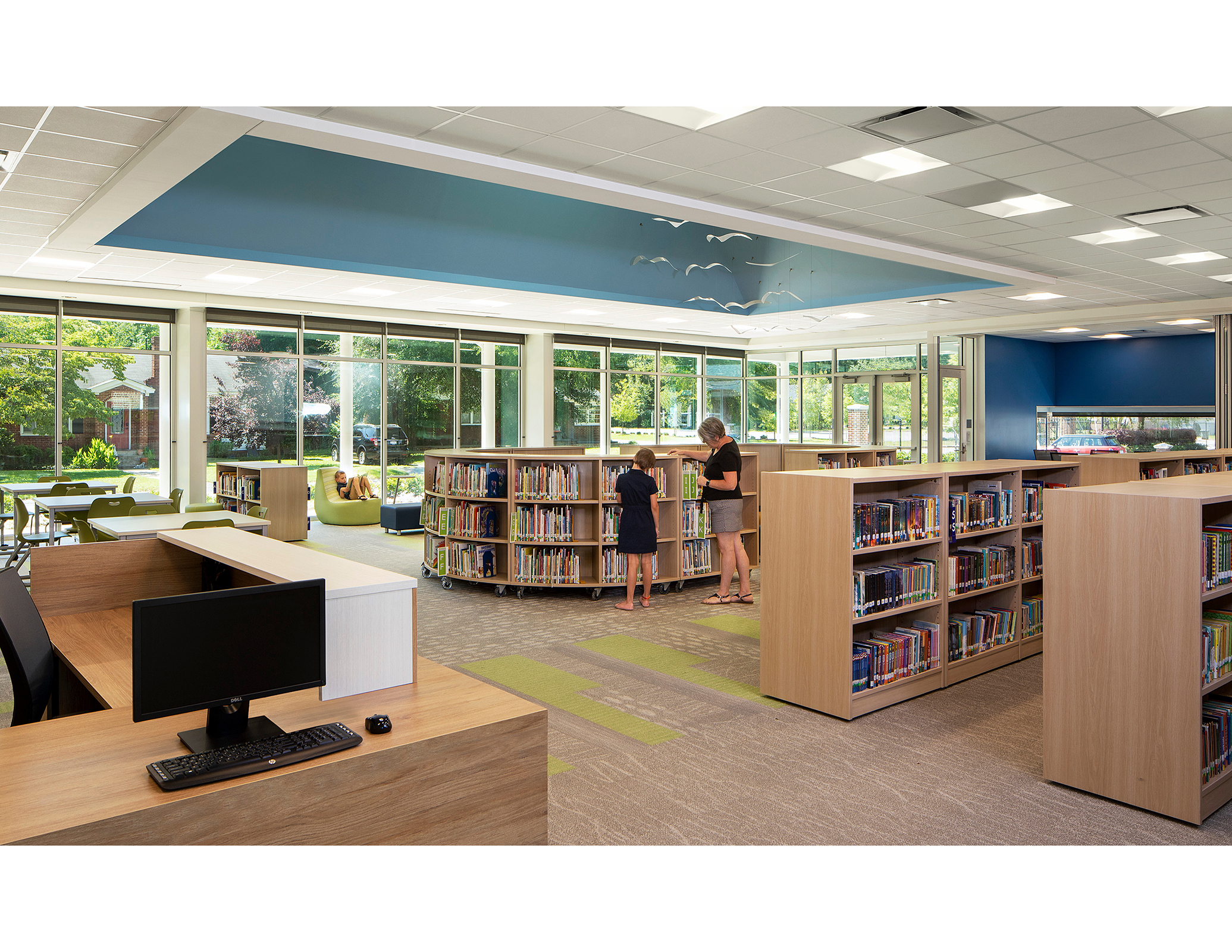 First constructed in the 1930’s, Rosewood Elementary School sought a reimagined library to support a broader range of individual and collaborative activities. With inadequate space available within the existing school, plans for a new library addition were developed, with an emphasis on these design strategies to foster learning and academic success: Allow Collaboration: The design provides open, comfortable spaces with soft seating and flexible furnishings to encourage spontaneous, enabled learning. Enable Customization: The reading room is organized into zones that support varying group sizes and activities, from individual study to one-on-one coaching or small group collaboration, and even multi-class assembly. Plan for Flexibility, Mobility, and Agility: The flexibility of the plan and furnishings not only provides customization in the moment, but also sets the stage for evolution over time. Maximize Comfort: In addition to soft seating, the comfort of the space is optimized in terms of daylighting, views outdoors, acoustics, and air quality. A soothing color-palette of blues, greens, and neutrals promotes calm and contemplation. Adapt to Technology: Wired and wireless infrastructure allows anytime/anywhere access, not only planning for the needs of today, but also preparing for the needs of tomorrow. A final charge to the design team was to create a space that stimulates the imagination of a child. By using colors seen in nature, creating a cozy “bird nest” between two curving bookshelves, keeping the interiors scaled for children, and providing a dramatic sculpture of birds in flight ascending into the lightwell, this space does just that.