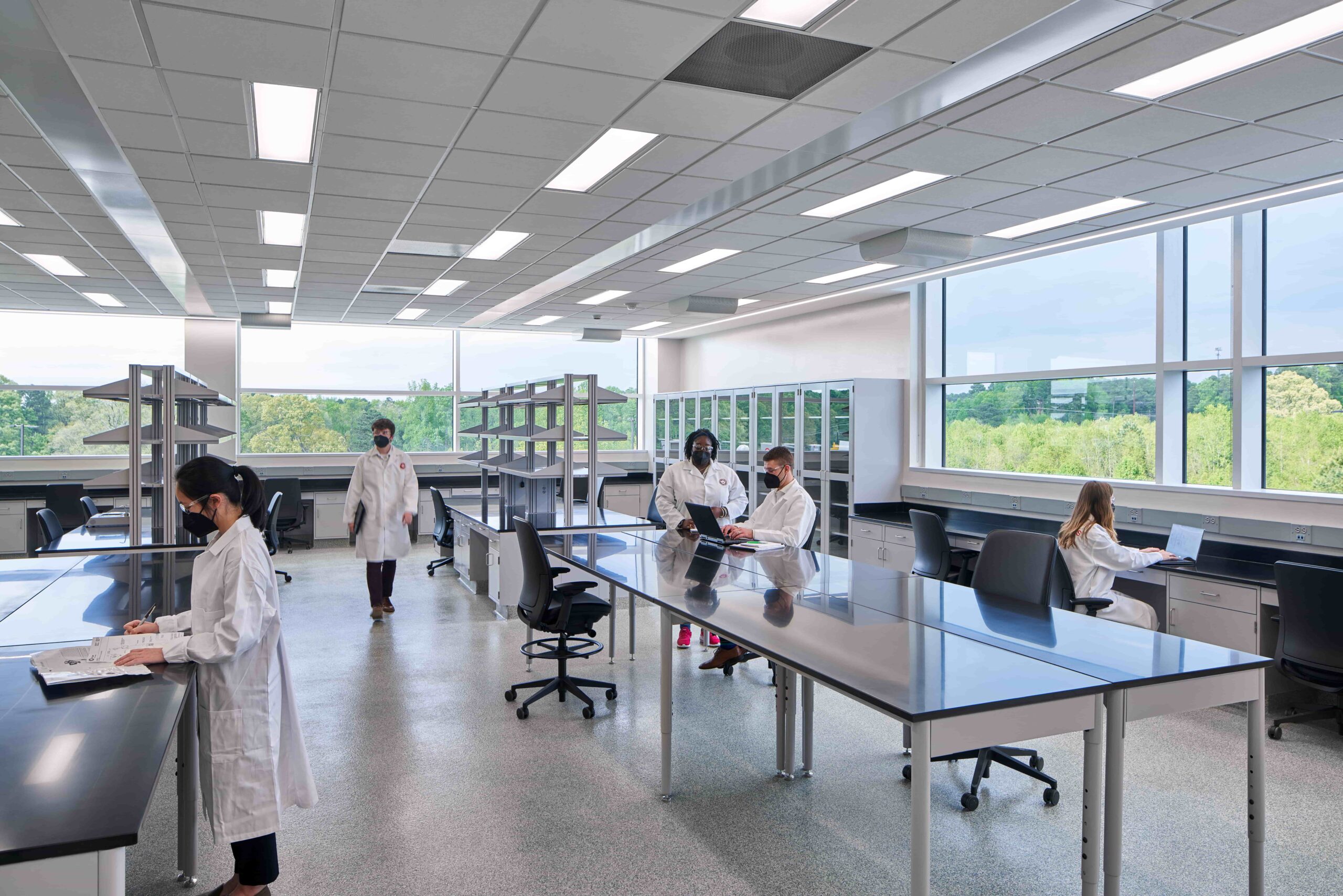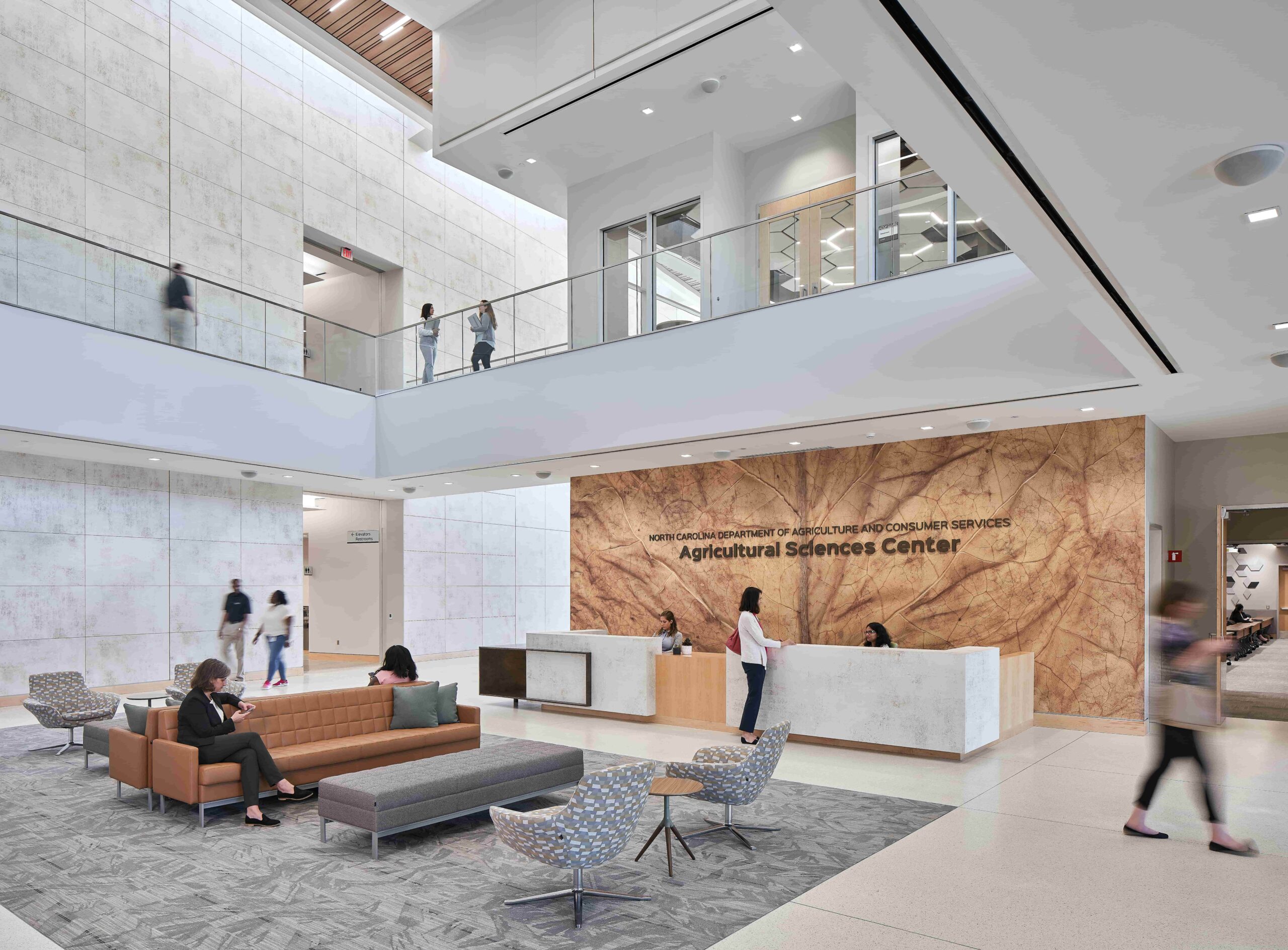 Throughout the Steve Troxler Agricultural Sciences Center, public space is identified through a two-story volume, daylit from a roof monitor and flanked by a variety of meeting and training rooms, informal gathering areas, and an employee breakroom. Each amenity area provides alternative workspaces and encourages collaboration by design.