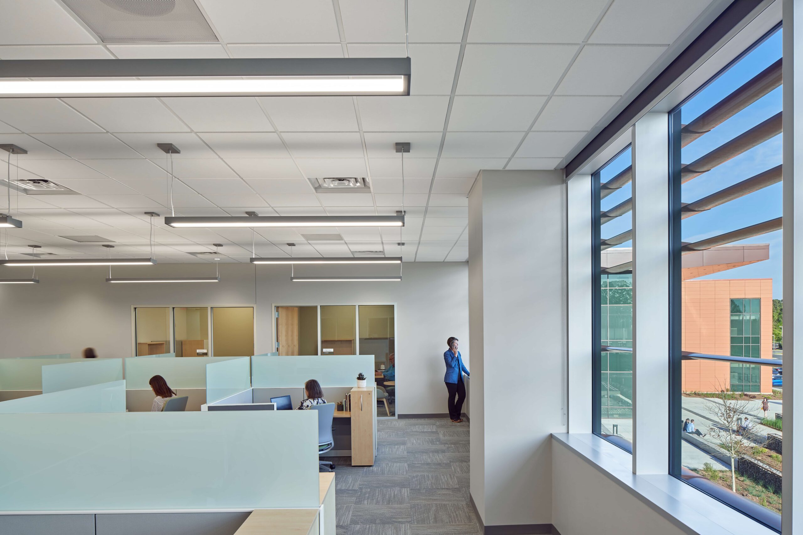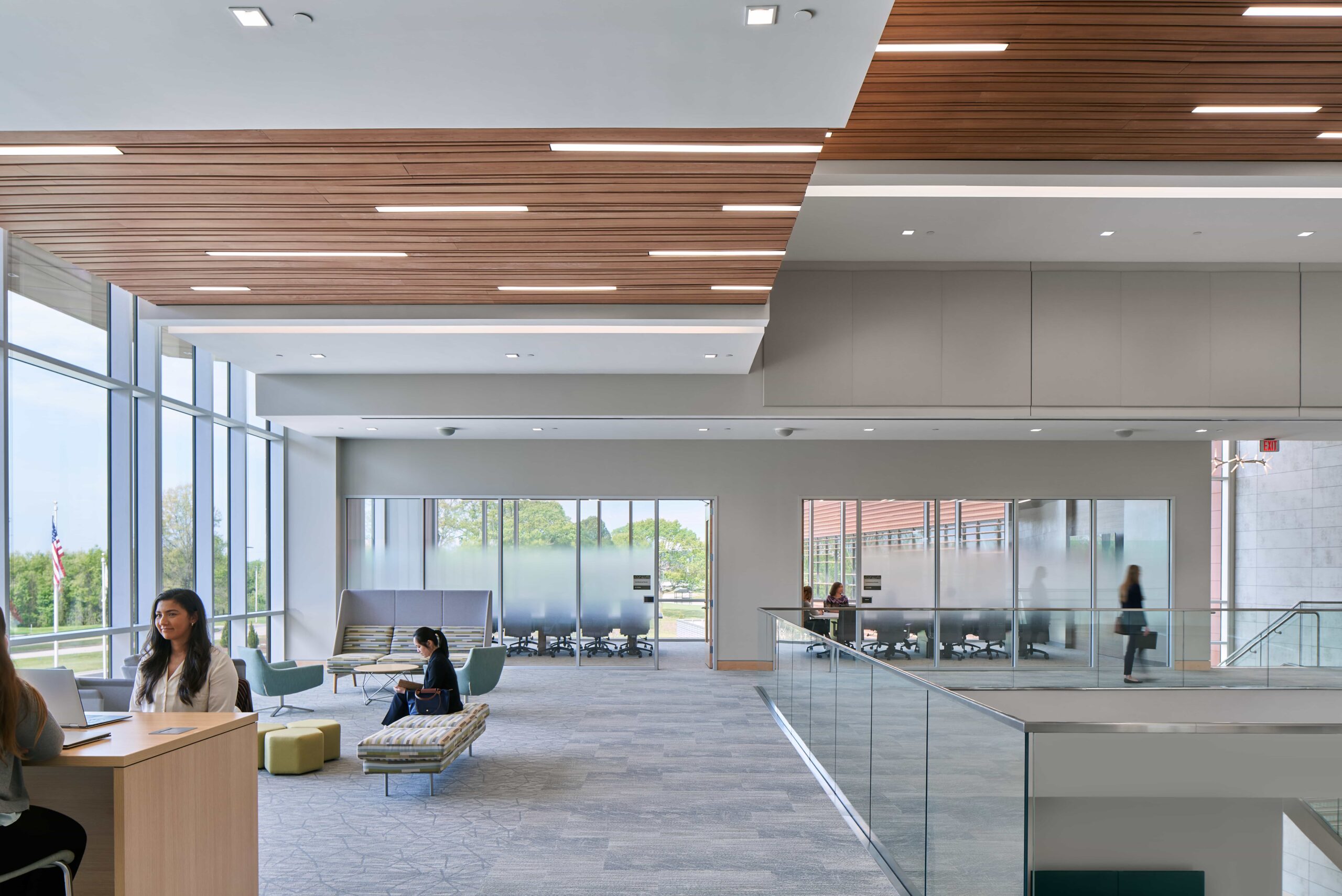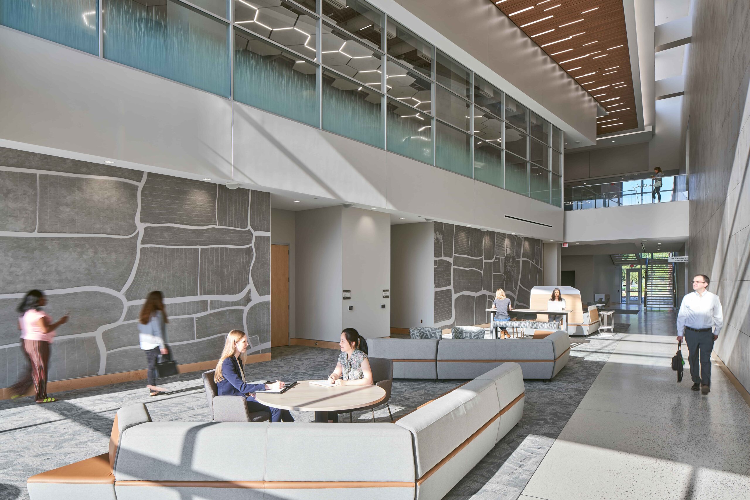Considering the building program and the rich agricultural history of North Carolina, the team selected interior finishes inspired by an agrarian palette. Familiar plant colors and patterns paired with wood ceilings and other natural elements link occupants to local outdoor scenery.