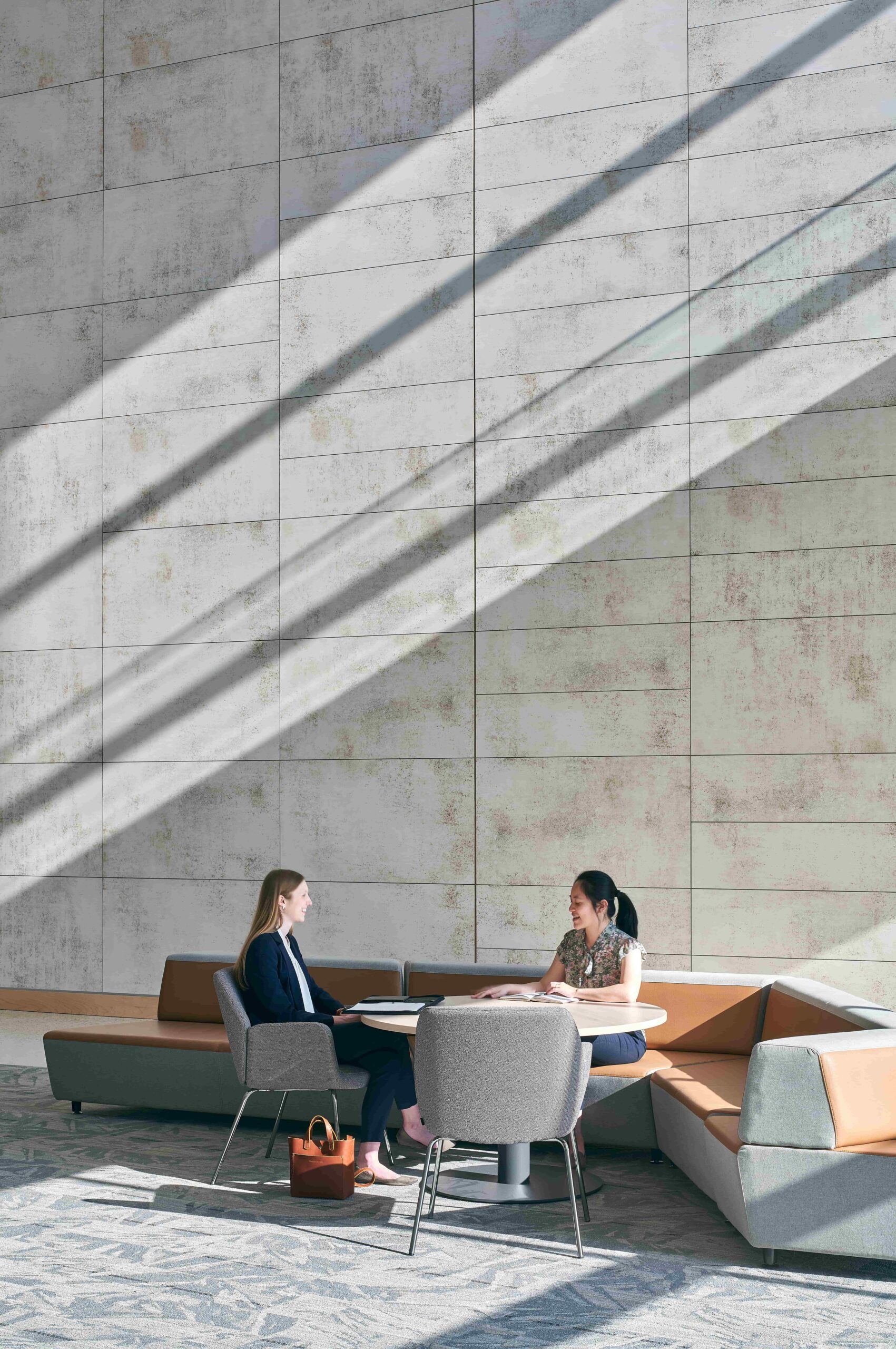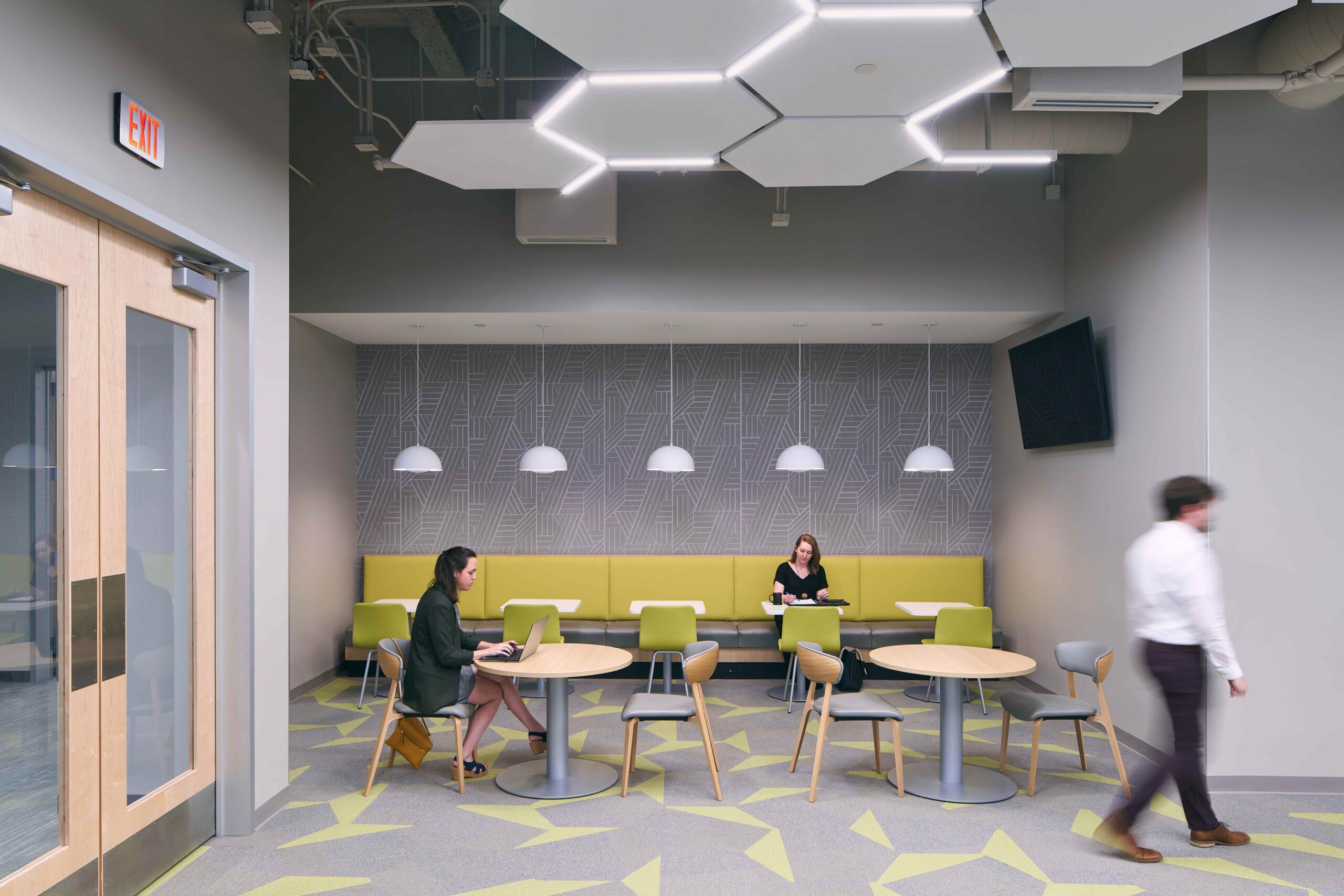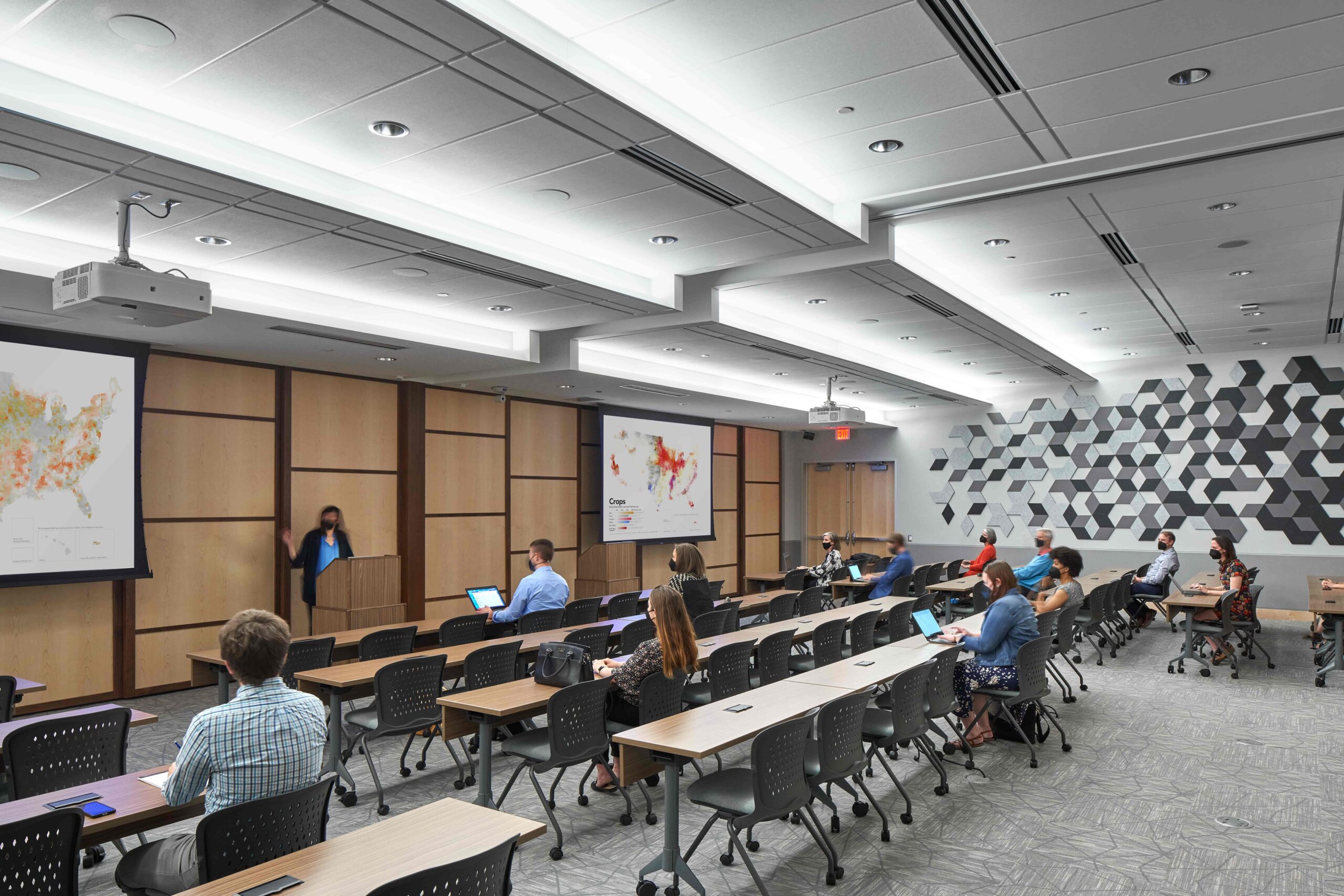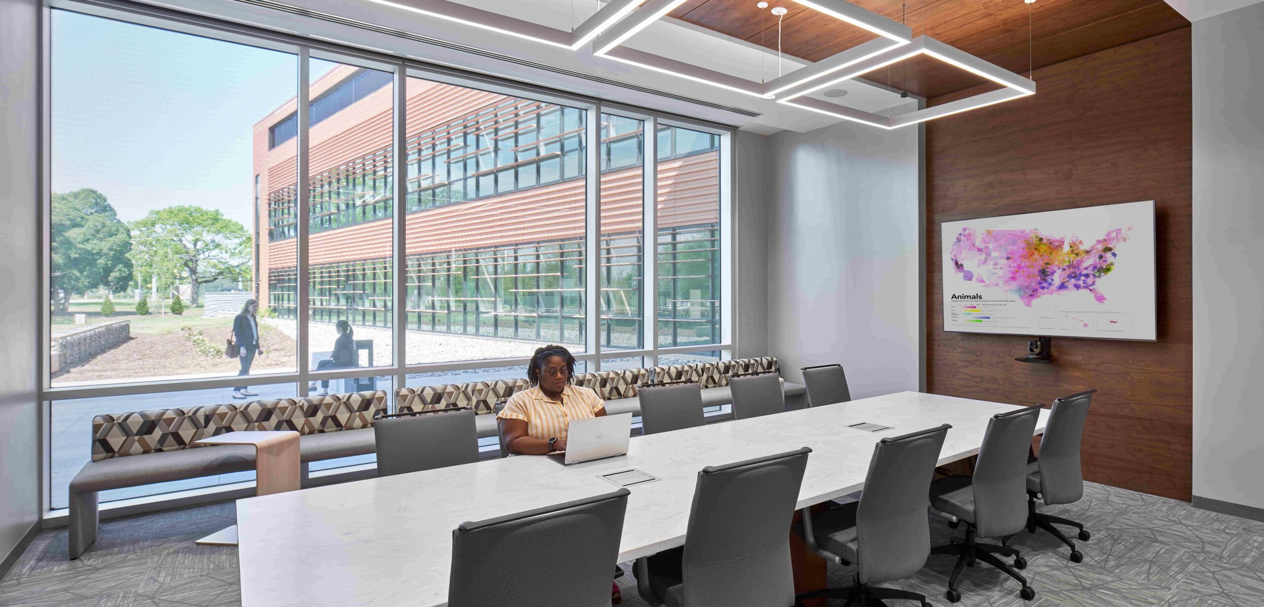 Considering the building program and the rich agricultural history of North Carolina, the team selected interior finishes inspired by an agrarian palette. Familiar plant colors and patterns paired with wood ceilings and other natural elements link occupants to local outdoor scenery.