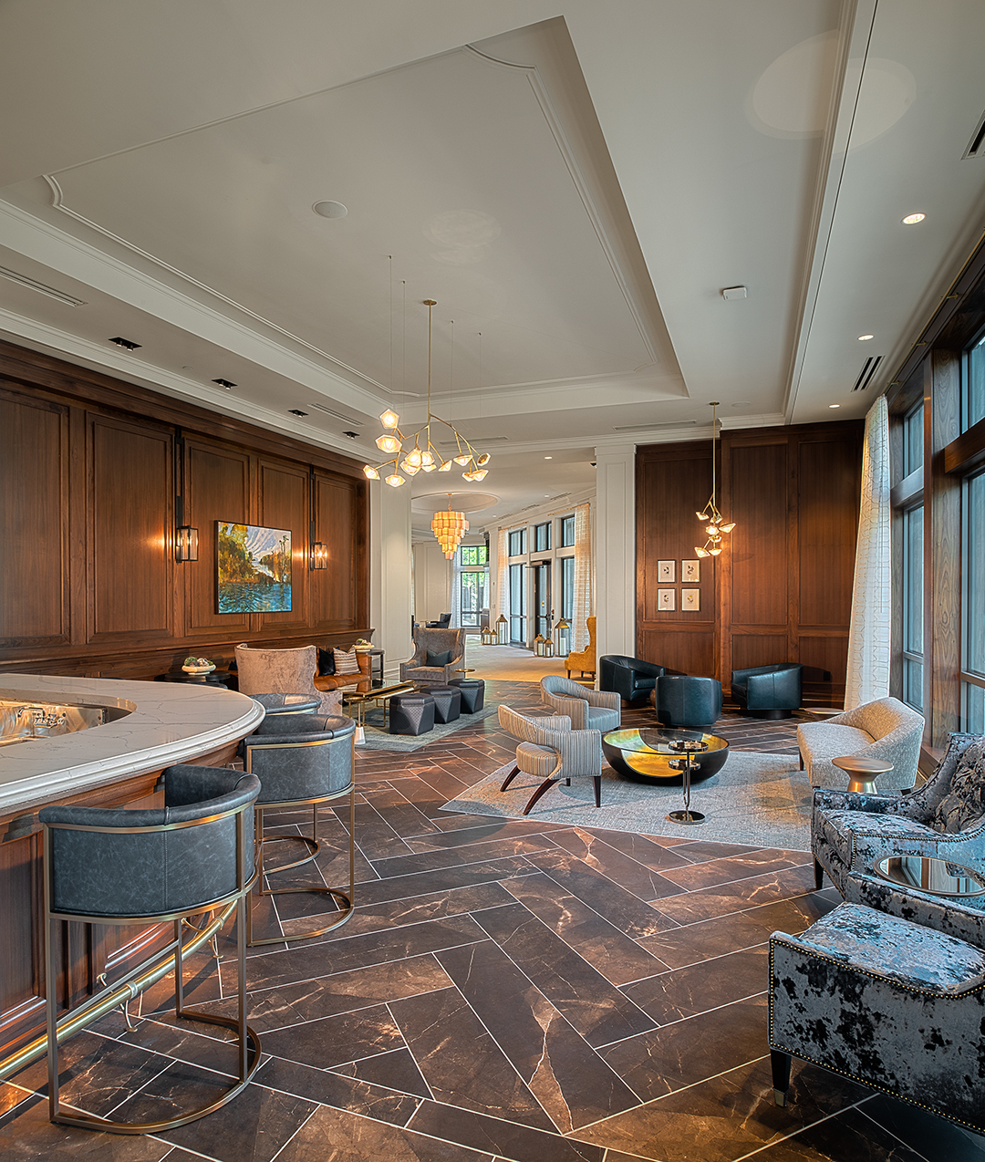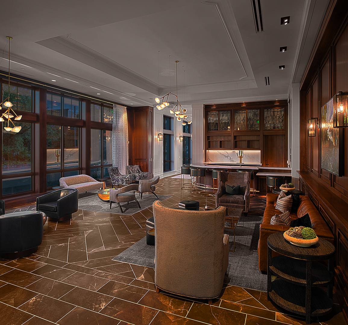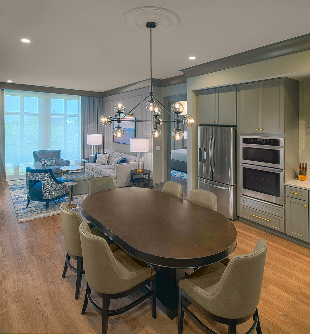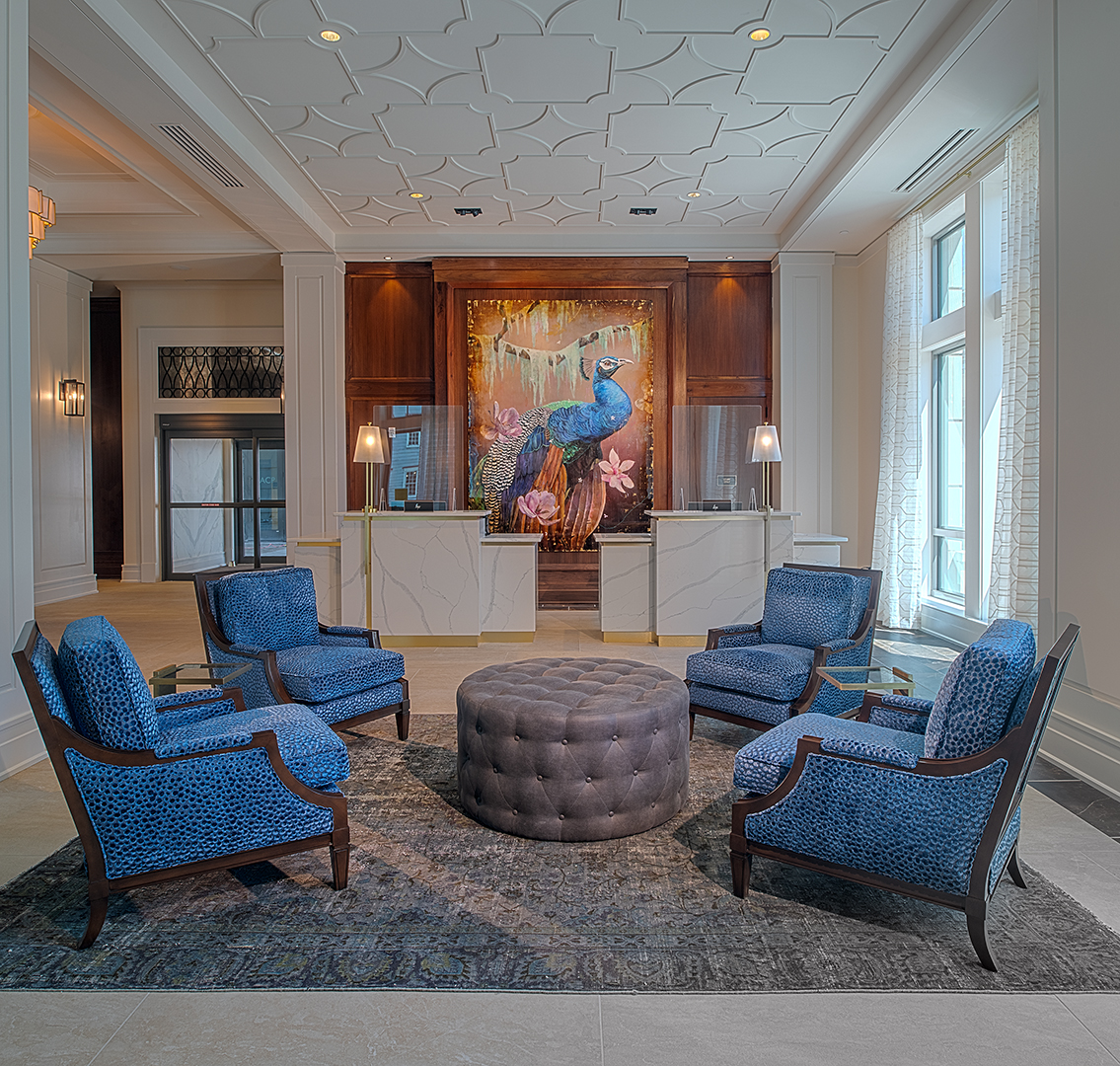 In the lobby, a backlit brass and wood feature wall honors the Liberty Tree that once stood on the site. Monumental coffered and relief décor ceilings, detailed wood paneling, light paint colors, and richly textured upholstery convey Charleston’s signature elegance throughout the ground floor public spaces. The custom bar in the ground floor lounge features antique glass mirror panels behind metal “ironwork” details. Marble countertops and custom cabinetry give owner units an air of sophisticated familiarity. Sconce light fixtures recall the lanterns adorning Charleston porches and front doors.