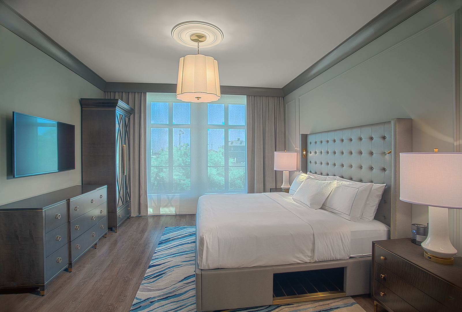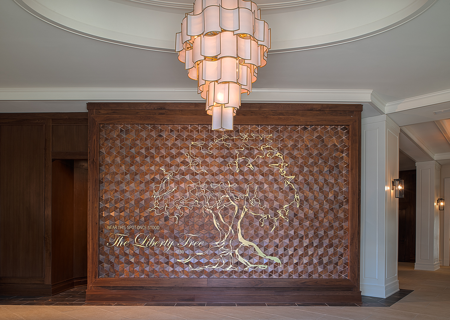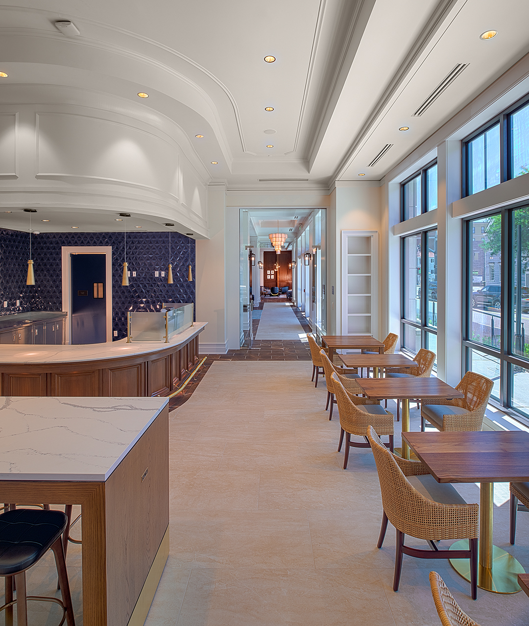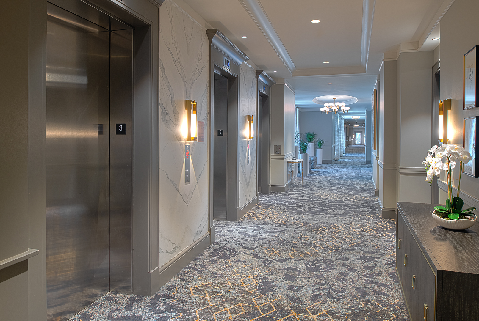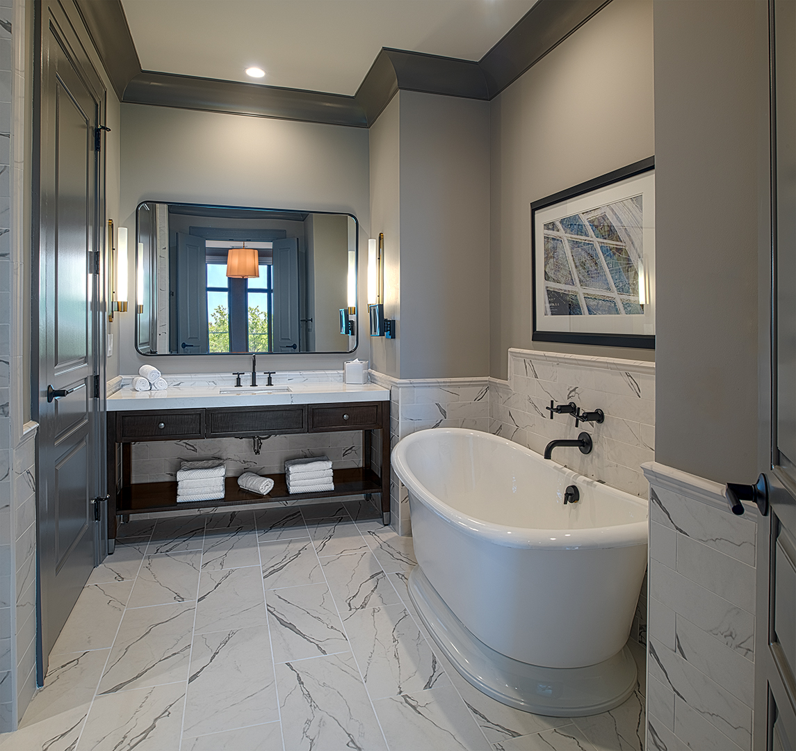 In the lobby, a backlit brass and wood feature wall honors the Liberty Tree that once stood on the site. Monumental coffered and relief décor ceilings, detailed wood paneling, light paint colors, and richly textured upholstery convey Charleston’s signature elegance throughout the ground floor public spaces. The custom bar in the ground floor lounge features antique glass mirror panels behind metal “ironwork” details. Marble countertops and custom cabinetry give owner units an air of sophisticated familiarity. Sconce light fixtures recall the lanterns adorning Charleston porches and front doors.
