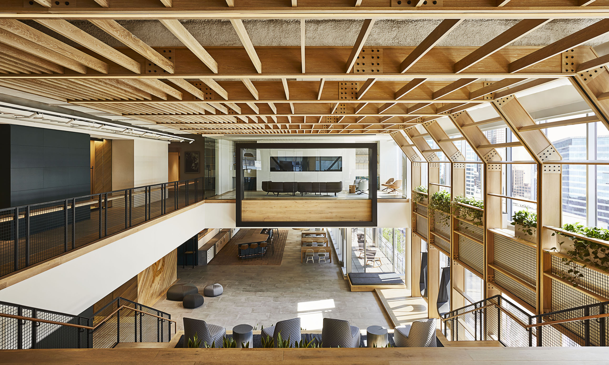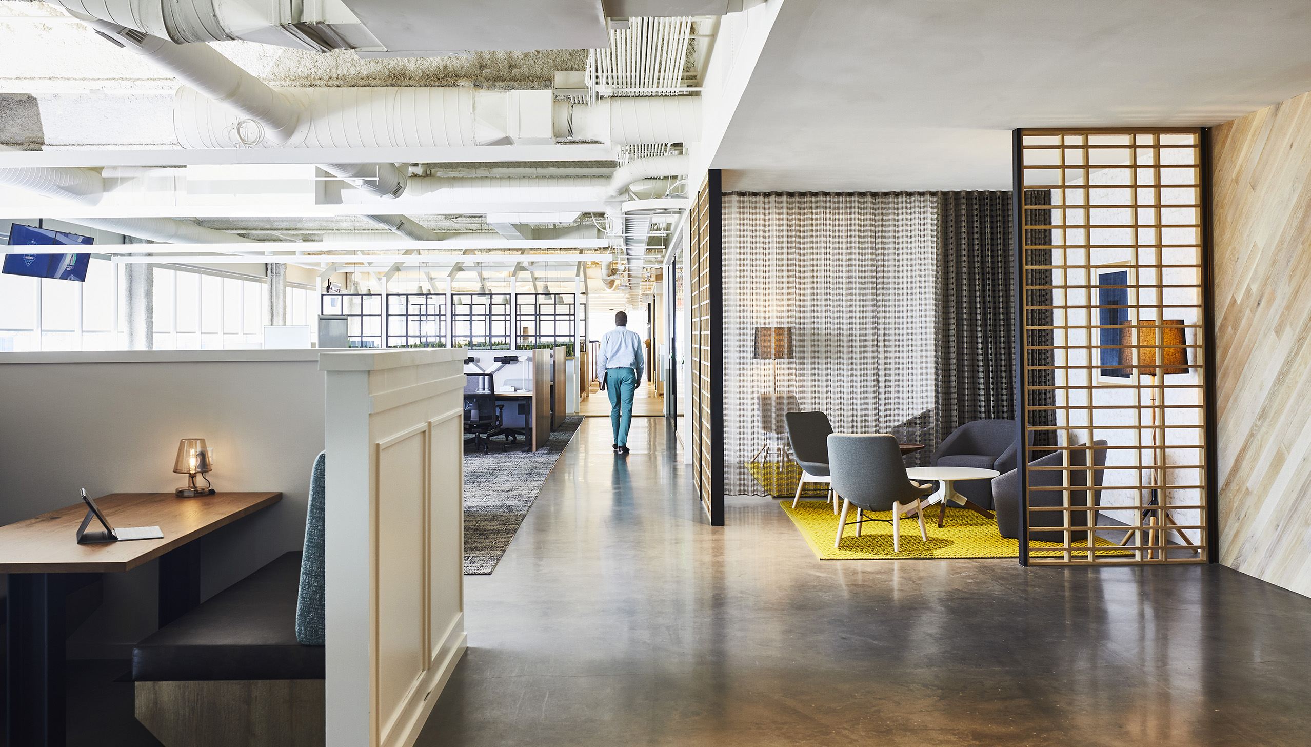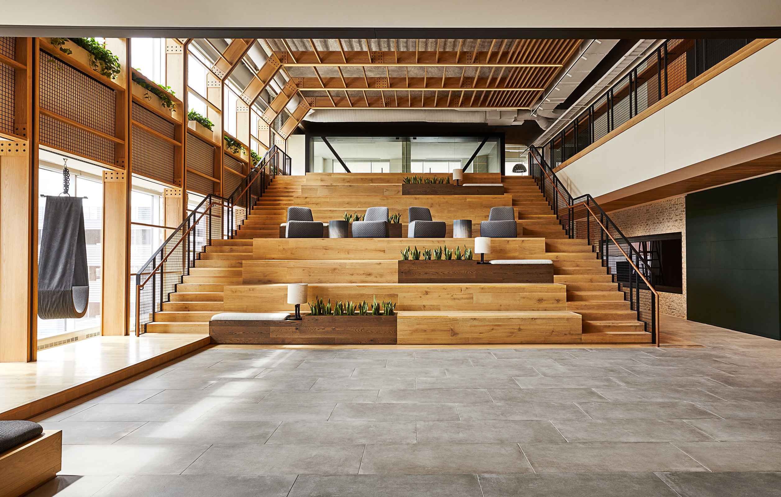 A monumental stair provides a vertical connection, central to the overall workplace. An upholstered niche is carved out beneath the stair, which provides an unexpected destination for casual work. The textured drapery spanning both floors, and the large-scale check pattern wallcovering add warmth to the voluminous space and supports their culture of comfortability and collaboration.