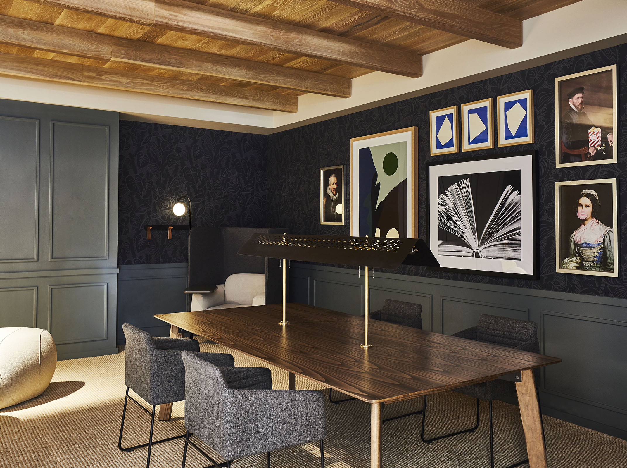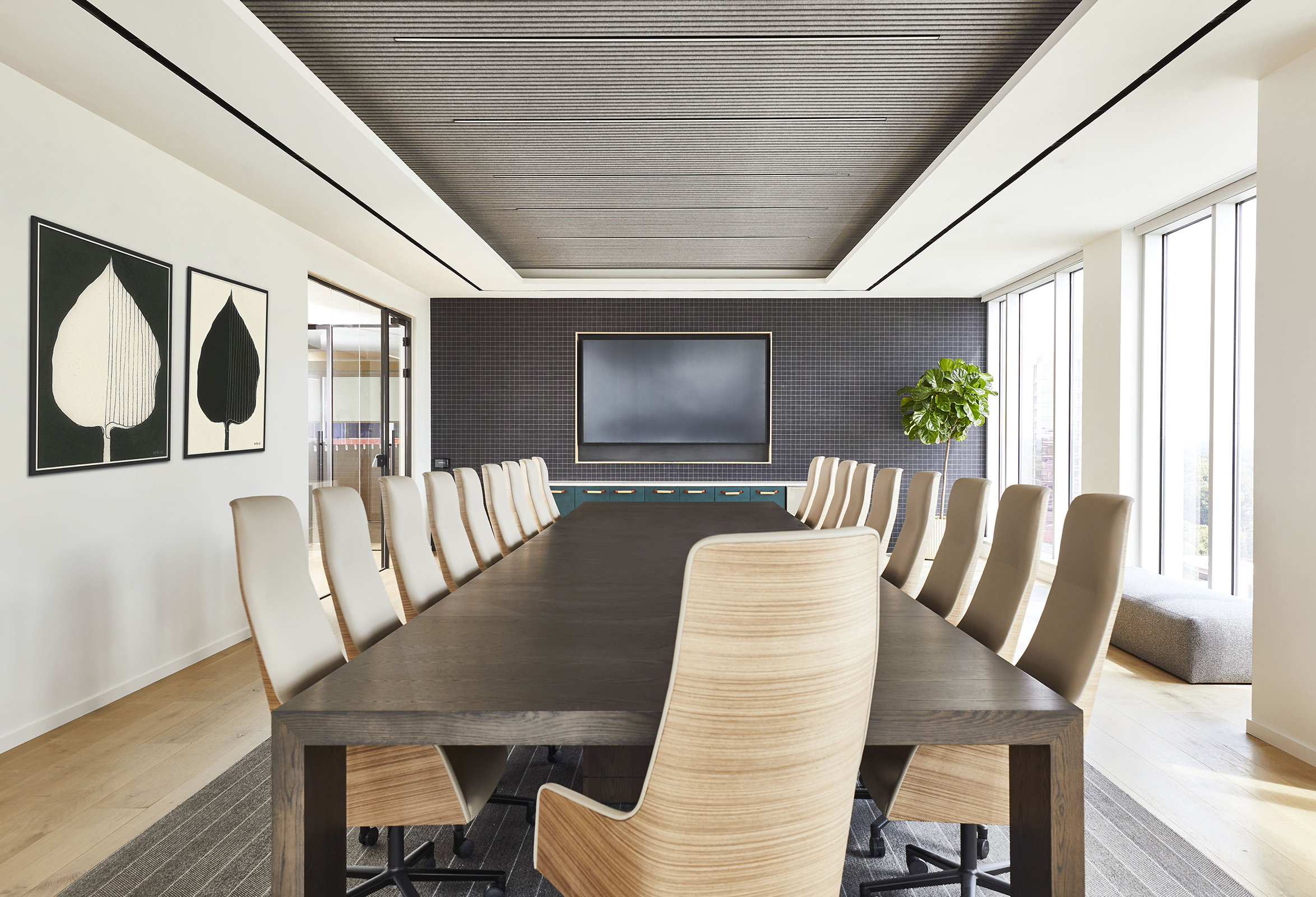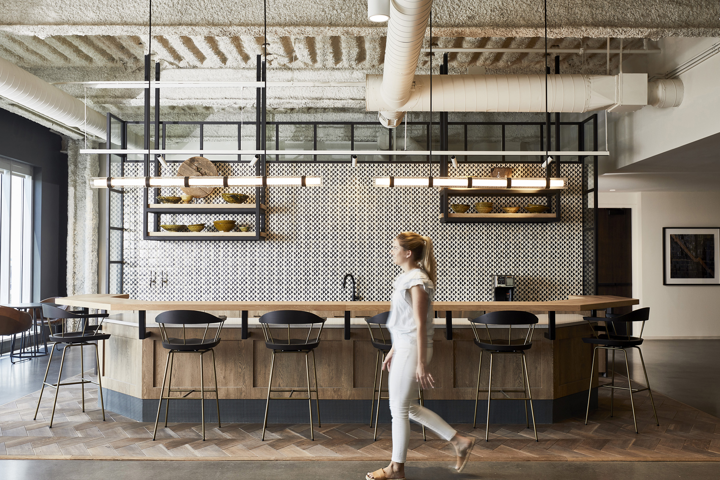 A monumental stair provides a vertical connection, central to the overall workplace. An upholstered niche is carved out beneath the stair, which provides an unexpected destination for casual work. The textured drapery spanning both floors, and the large-scale check pattern wallcovering add warmth to the voluminous space and supports their culture of comfortability and collaboration.