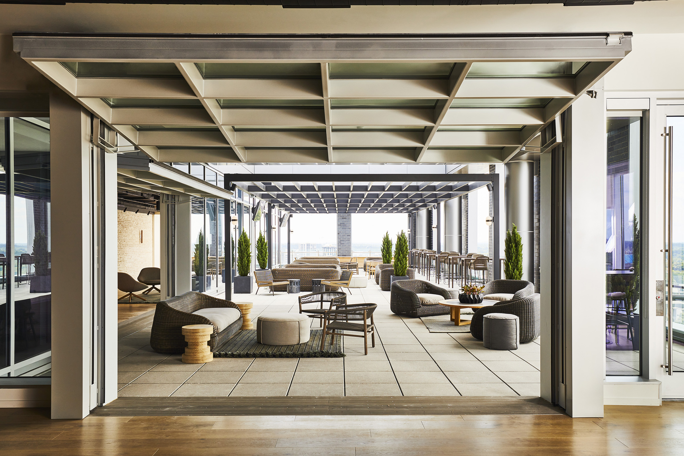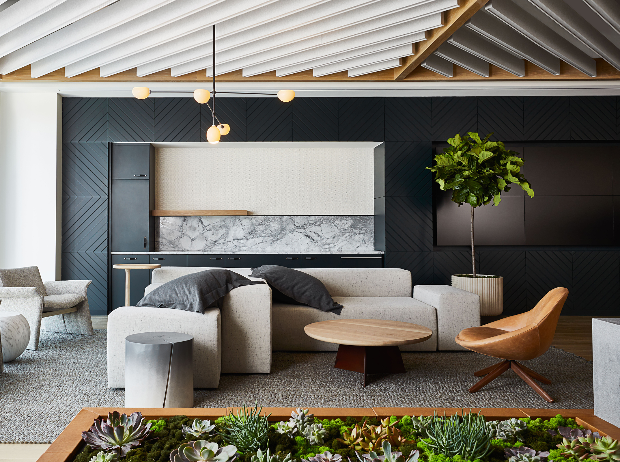 Lending Tree’s Town Hall space for all-staff meetings includes a custom wood pergola feature overhead and a connection to the work café below. The custom leather wrapped handrails, cascading plants along the window wall, and rocking chairs on the terrace help to establish the company’s culture with southern roots. Integrated lamps, custom planters, textural area rugs with living-room like furniture, and leaf logo shaped swings hanging above a wood platform create an inviting, comfortable vibe.