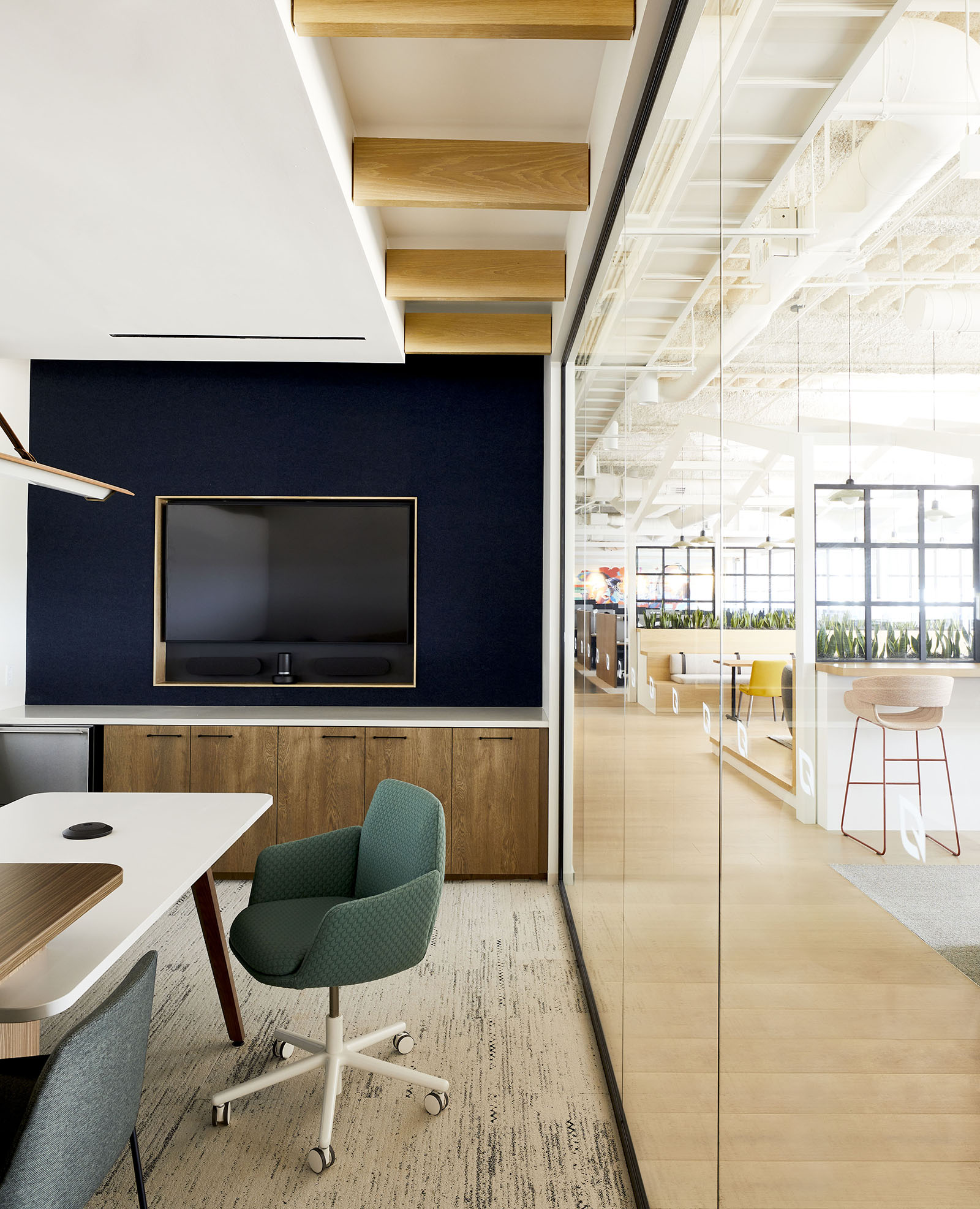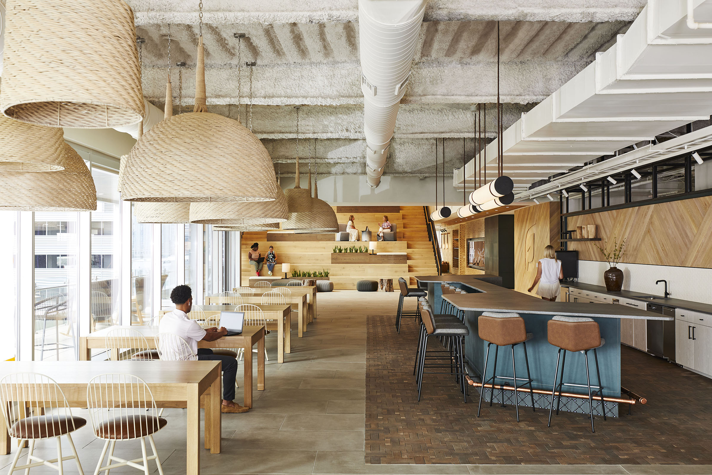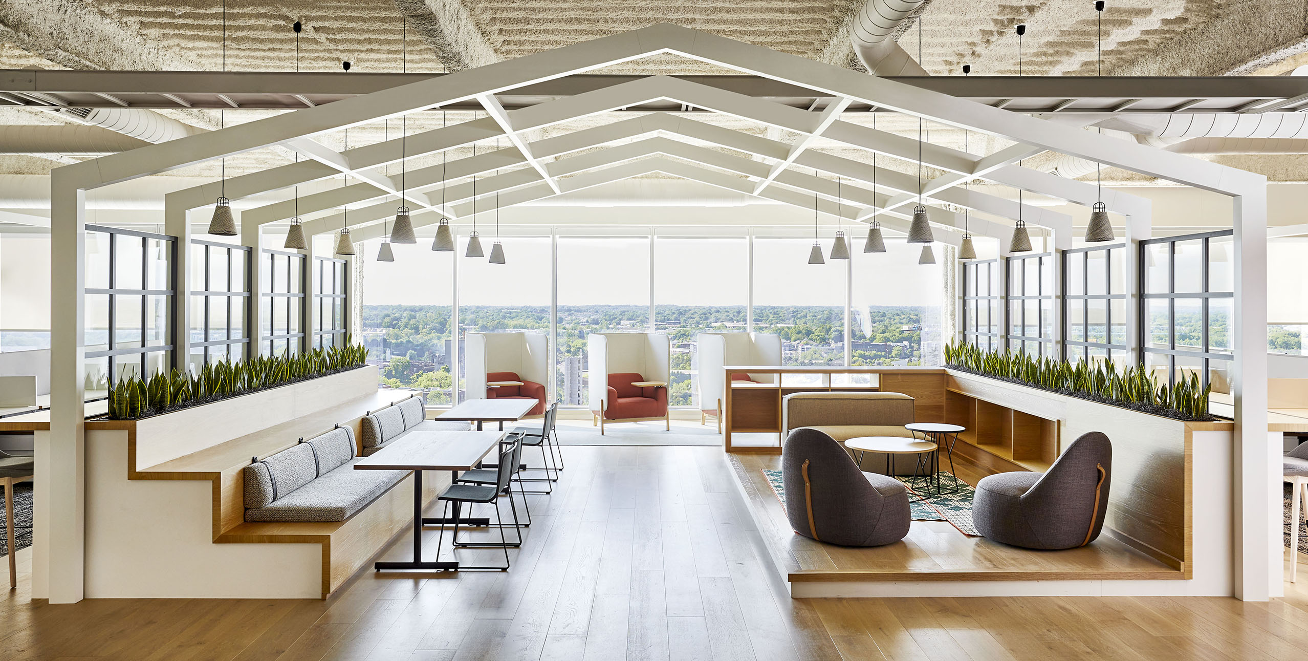 In the lobby area, the custom designed wood and felt ceiling feature relates to the structure of a leaf, and subtly relates to the company’s brand. Natural woven light fixtures create a canopy above casual meeting areas throughout the space. “Treehouse” areas on each floor break up the work environment and encourage alternate spaces to meet and work. The house-like structure and window elements tie back to LendingTree’s roots in the home mortgage industry.