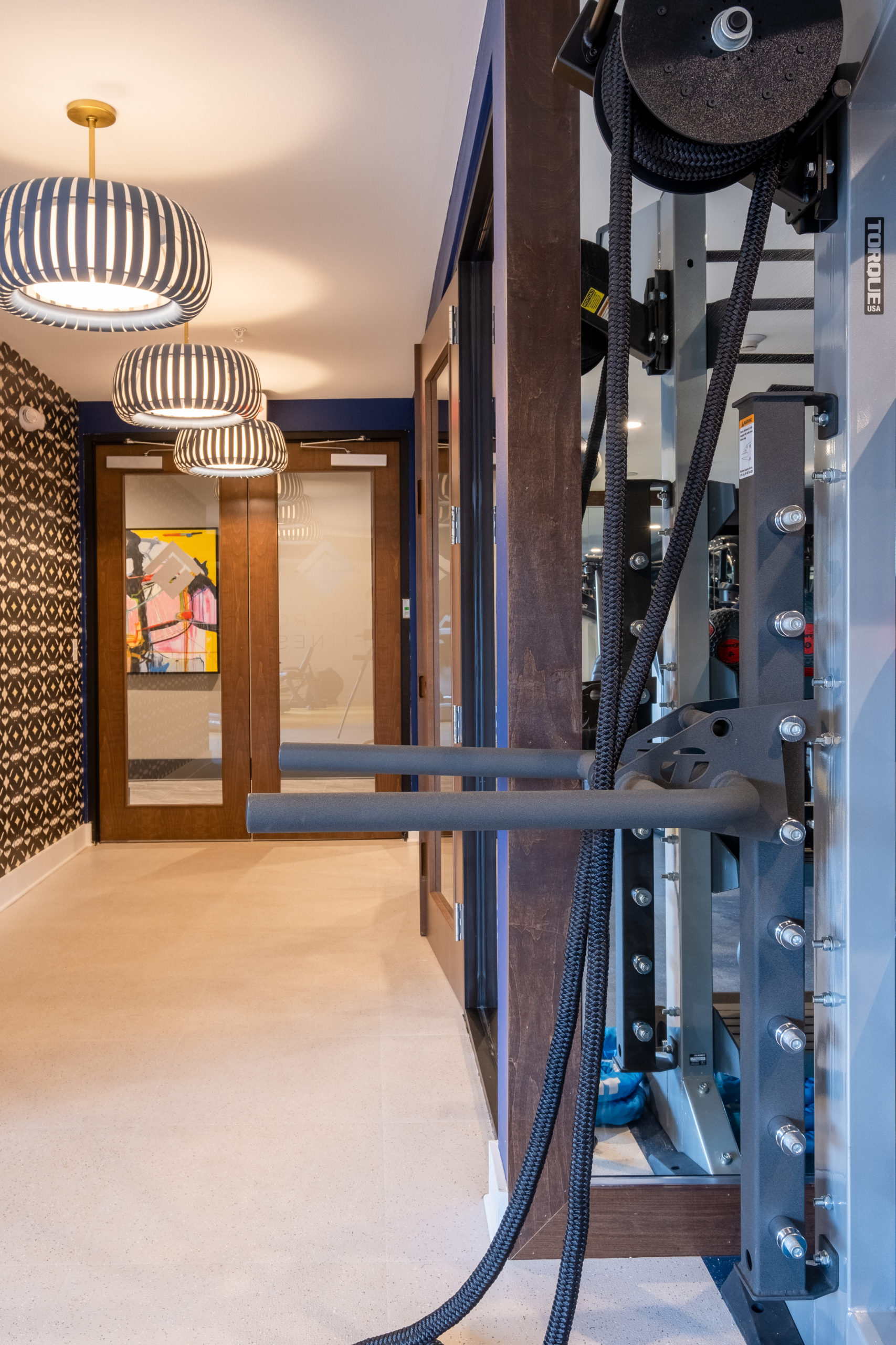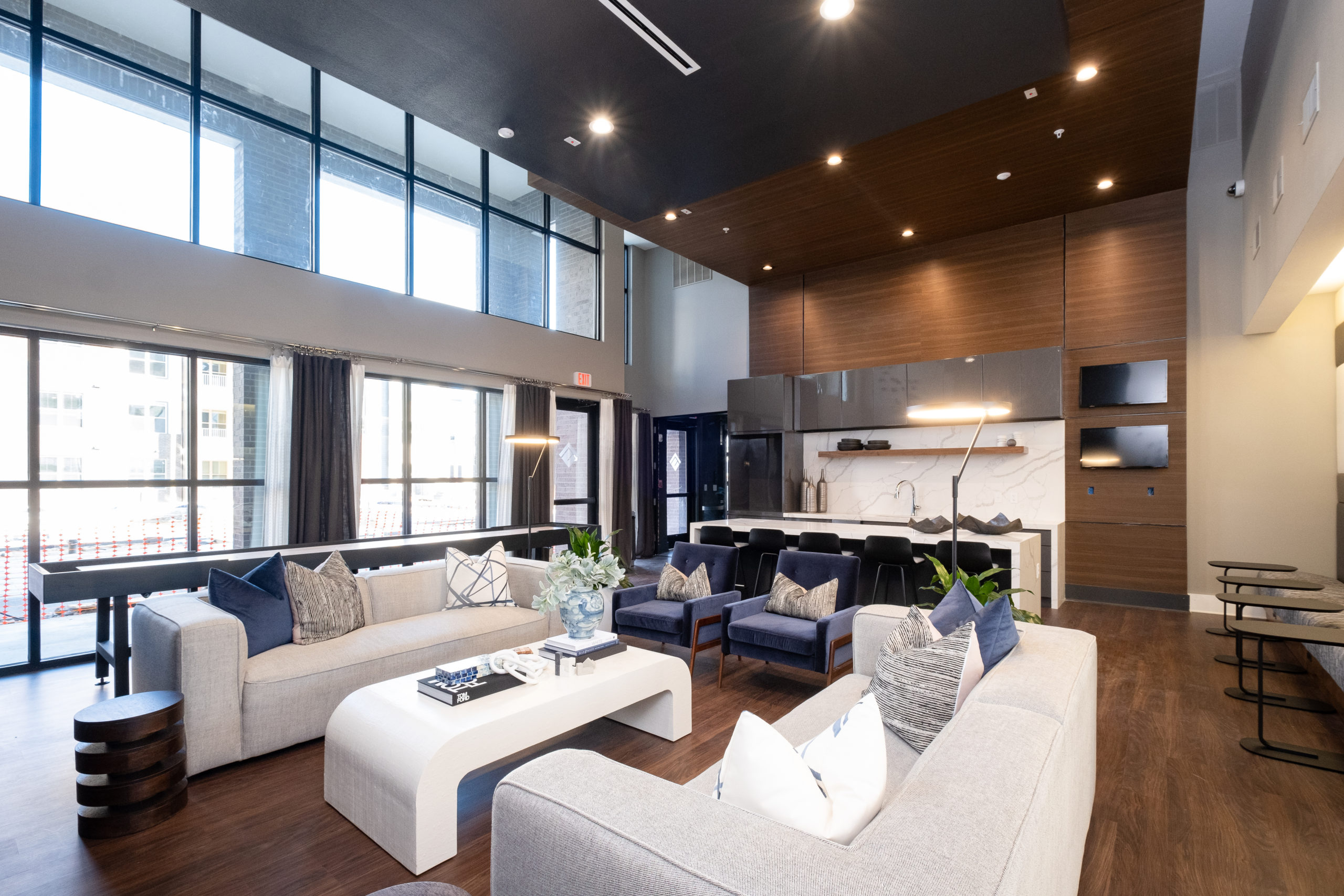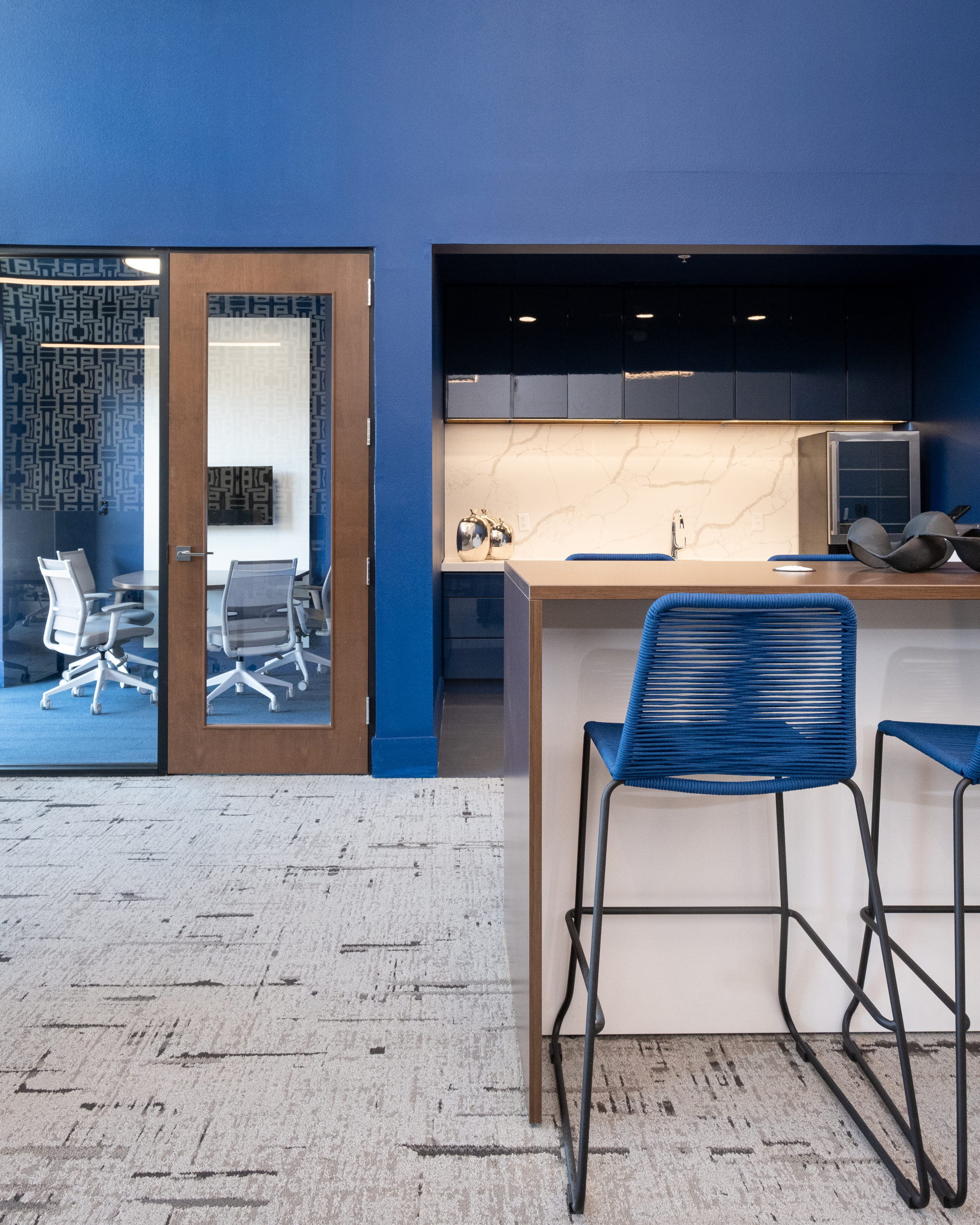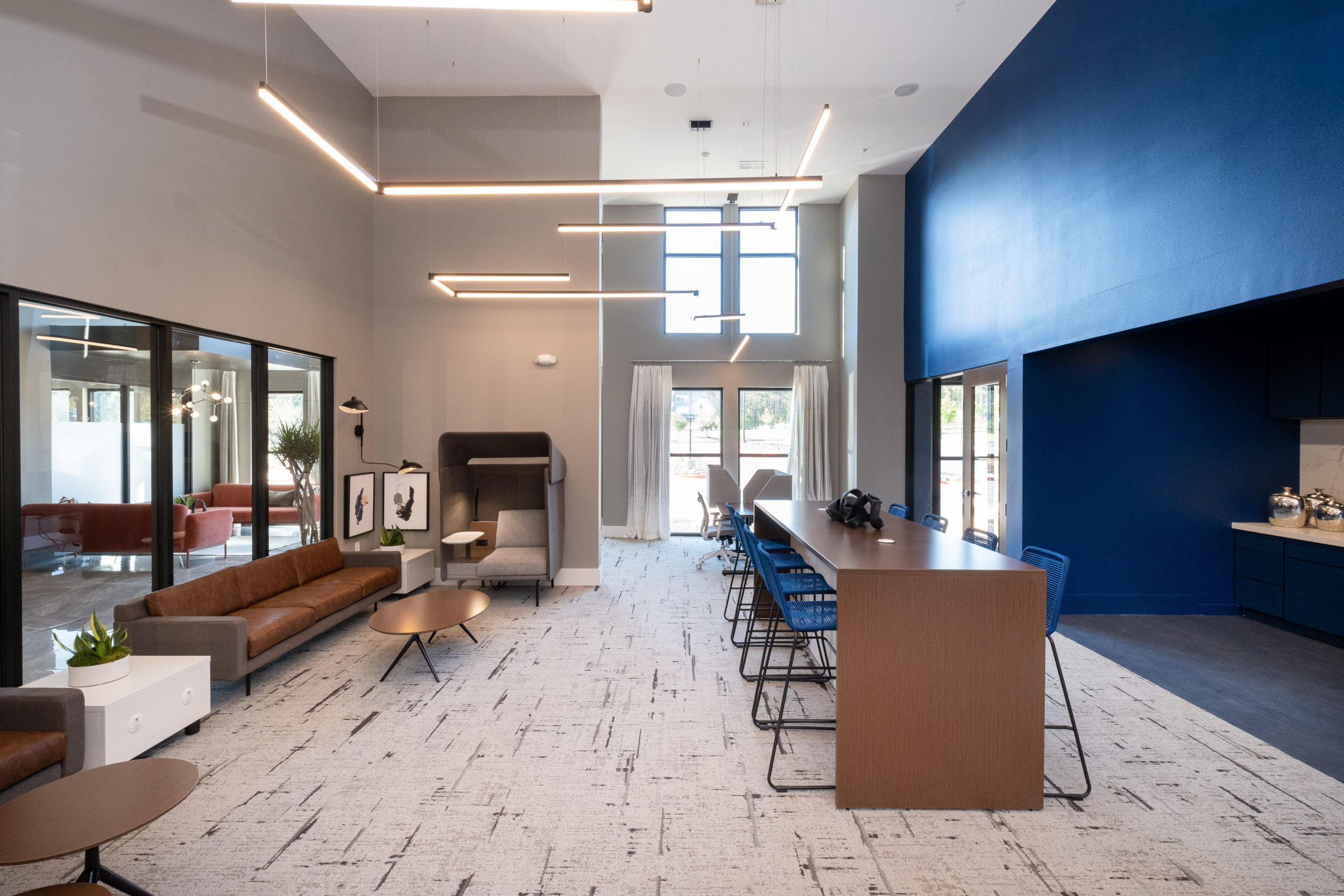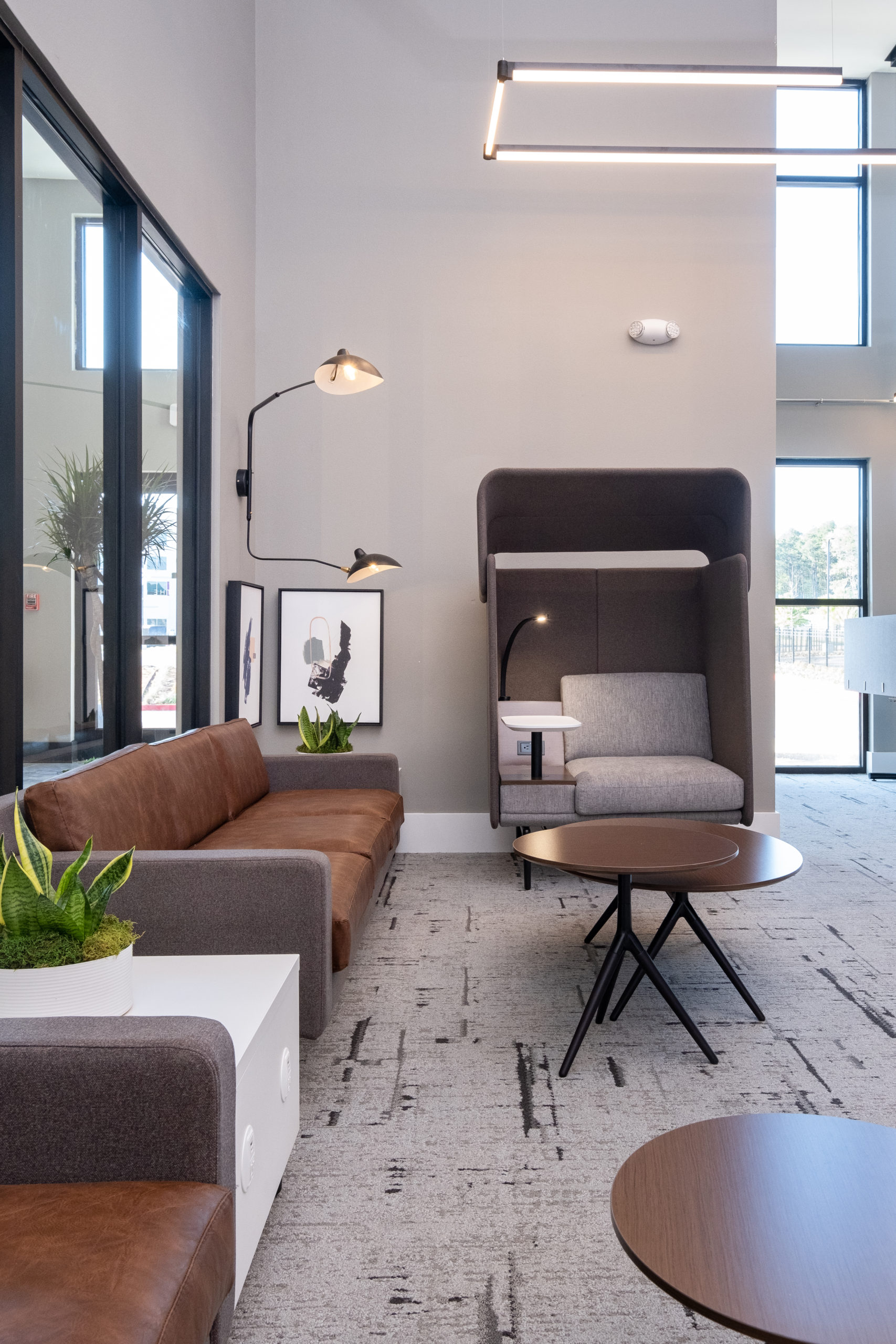 The Fitzroy Promenade project was an exciting opportunity to expand the brand’s footprint in the area. As the second location in Little Rock, the Promenade property was a unique opportunity to showcase how the Fitzroy brand could further be represented. The other anchor property is full of bright, white filled airy spaces. The goal here was to keep the same design standard but reach more of the market, not necessarily compete after the same potential residents. So, an overall scheme was developed that explored a more masculine aesthetic full of rich tones and textures. This property is located adjacent to the popular Promenade shopping center, so the goal was to be lively yet have its own identity where people could move and flow between the center but also feel just as content to “stay home” and use the many amenities. Rich walnut tones paired with contrasting whites and grays coupled with vibrant blues and yellow were used in varying ways to add unity to the clubhouse while creating individual spaces that were strong and destinations all on their own. Creating those destinations was not only important in style but definitely in function. A space plan was created to ensure residents could use the Mailroom, CoWork, and Fitness 24/7, with the Social Room having extended hours but controlled by management. With intentional space planning and clear understanding of the client and program along with door controls, the client is able to maximize their investment in resident usability and therefore marketability.
