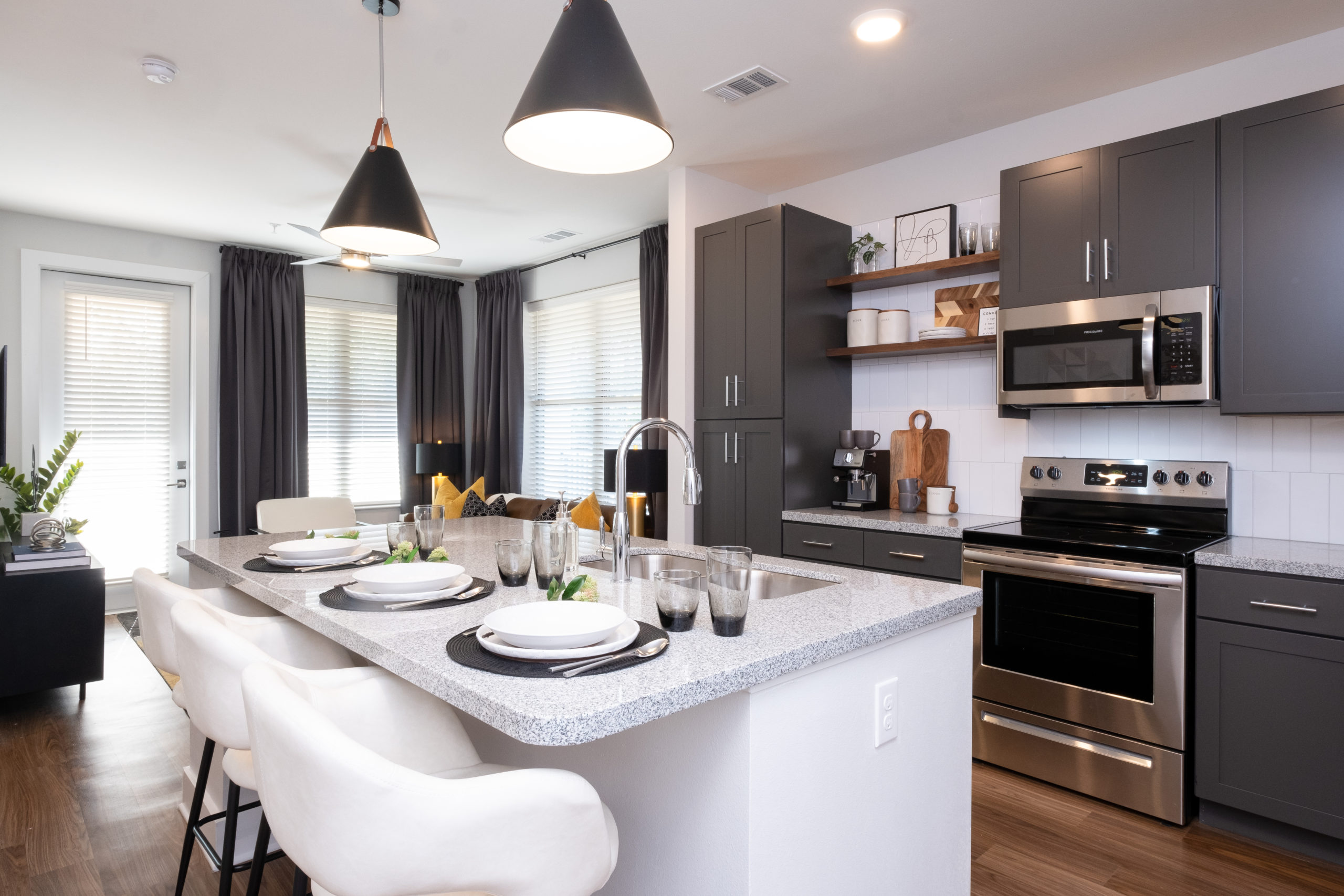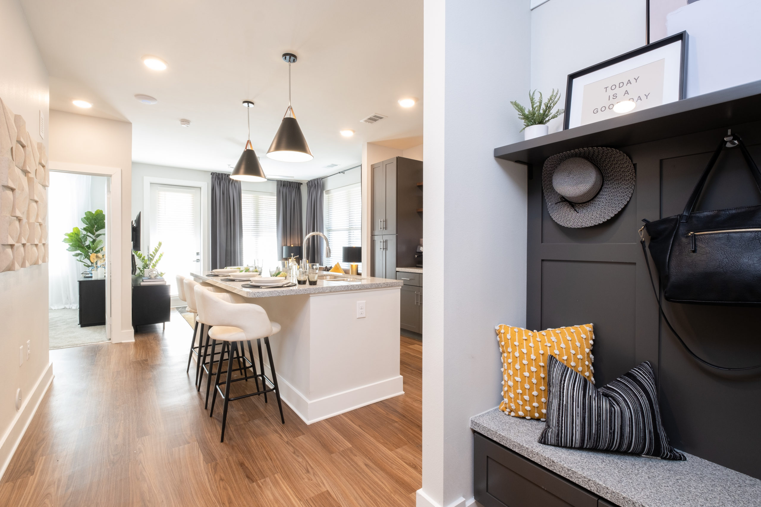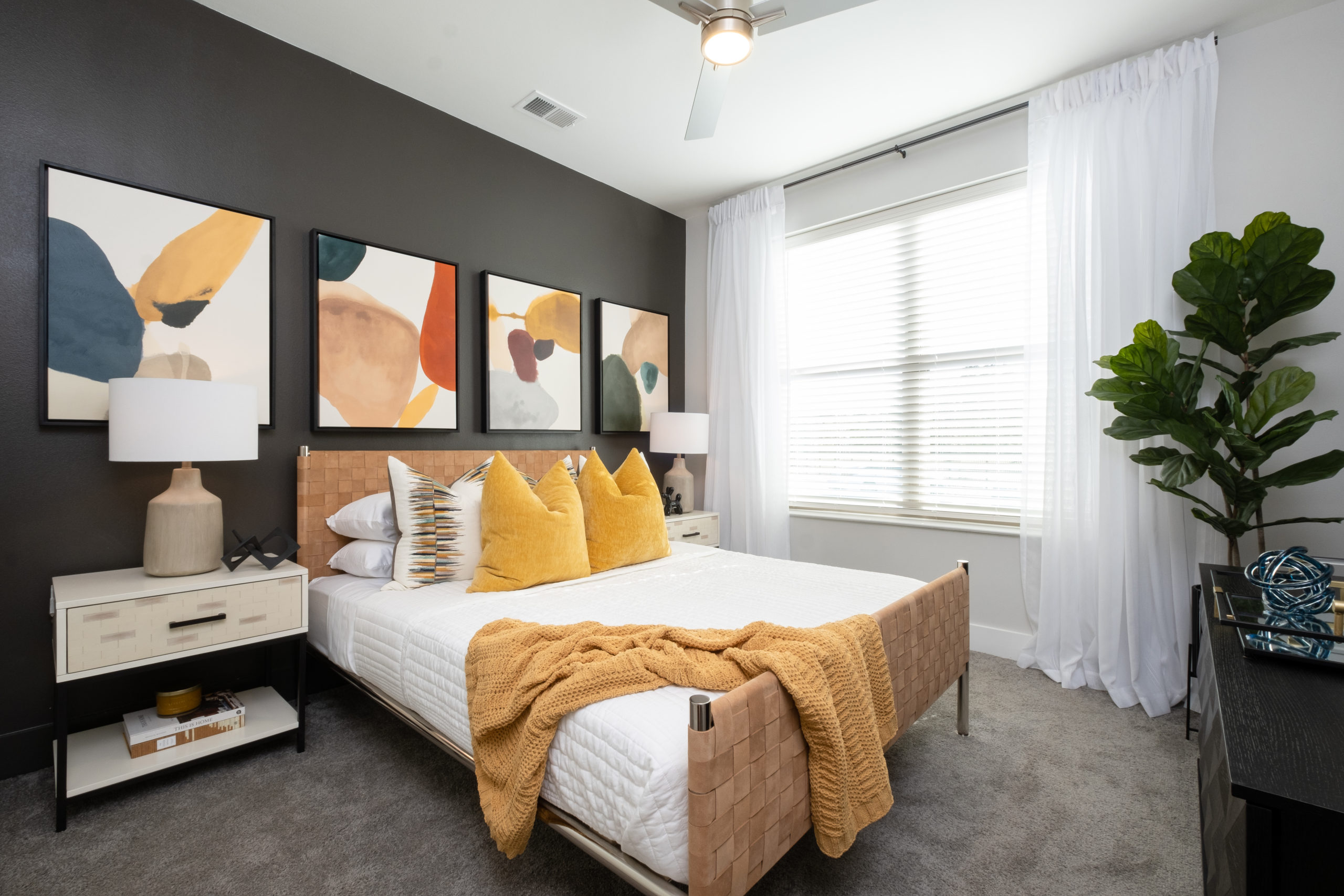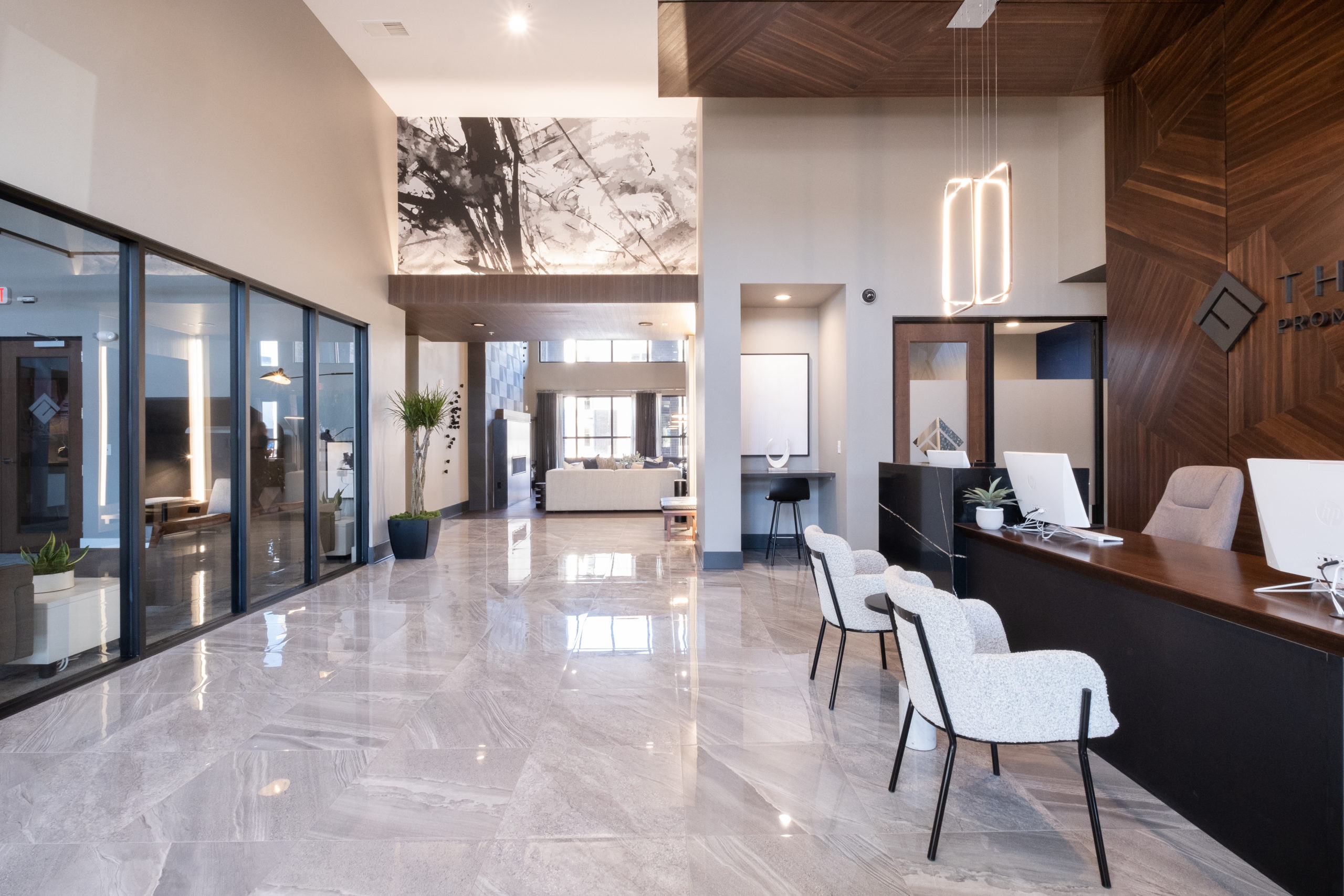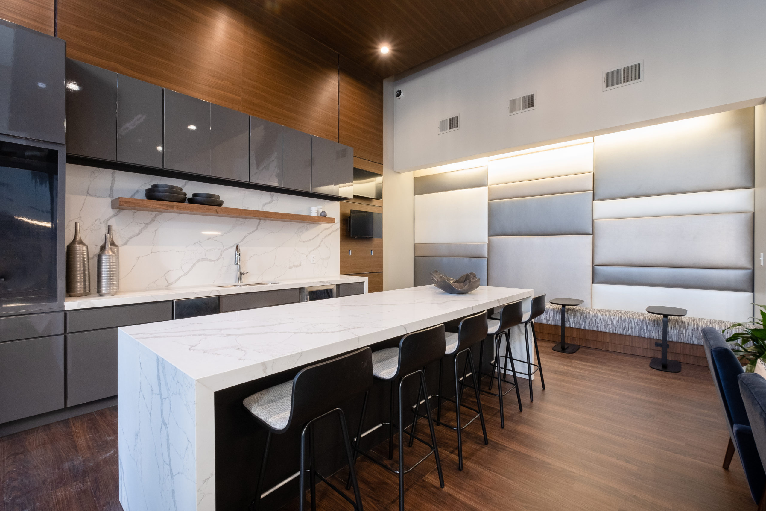 The Fitzroy Promenade project was an exciting opportunity to expand the brand’s footprint in the area. As the second location in Little Rock, the Promenade property was a unique opportunity to showcase how the Fitzroy brand could further be represented. The other anchor property is full of bright, white filled airy spaces. The goal here was to keep the same design standard but reach more of the market, not necessarily compete after the same potential residents. So, an overall scheme was developed that explored a more masculine aesthetic full of rich tones and textures. This property is located adjacent to the popular Promenade shopping center, so the goal was to be lively yet have its own identity where people could move and flow between the center but also feel just as content to “stay home” and use the many amenities. Rich walnut tones paired with contrasting whites and grays coupled with vibrant blues and yellow were used in varying ways to add unity to the clubhouse while creating individual spaces that were strong and destinations all on their own. Creating those destinations was not only important in style but definitely in function. A space plan was created to ensure residents could use the Mailroom, CoWork, and Fitness 24/7, with the Social Room having extended hours but controlled by management. With intentional space planning and clear understanding of the client and program along with door controls, the client is able to maximize their investment in resident usability and therefore marketability.