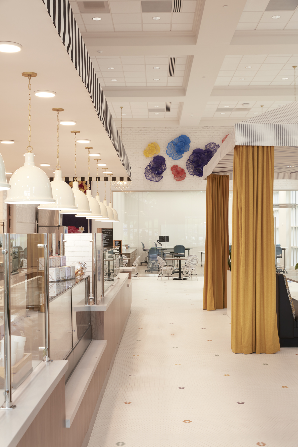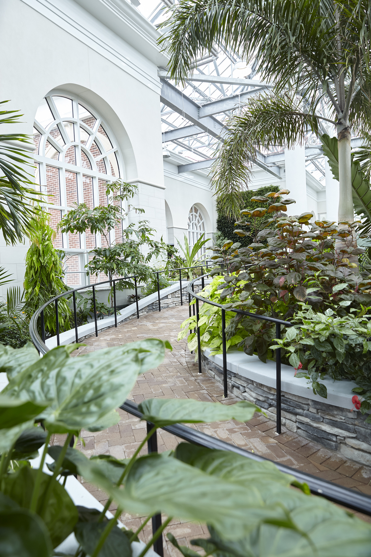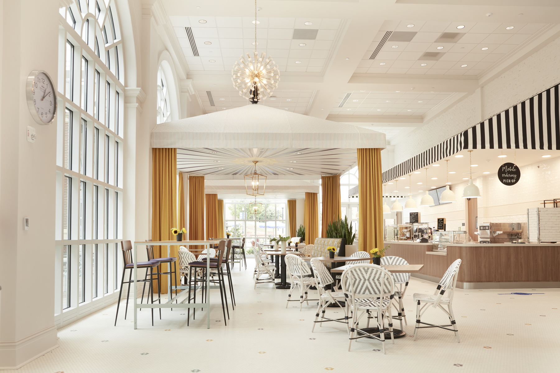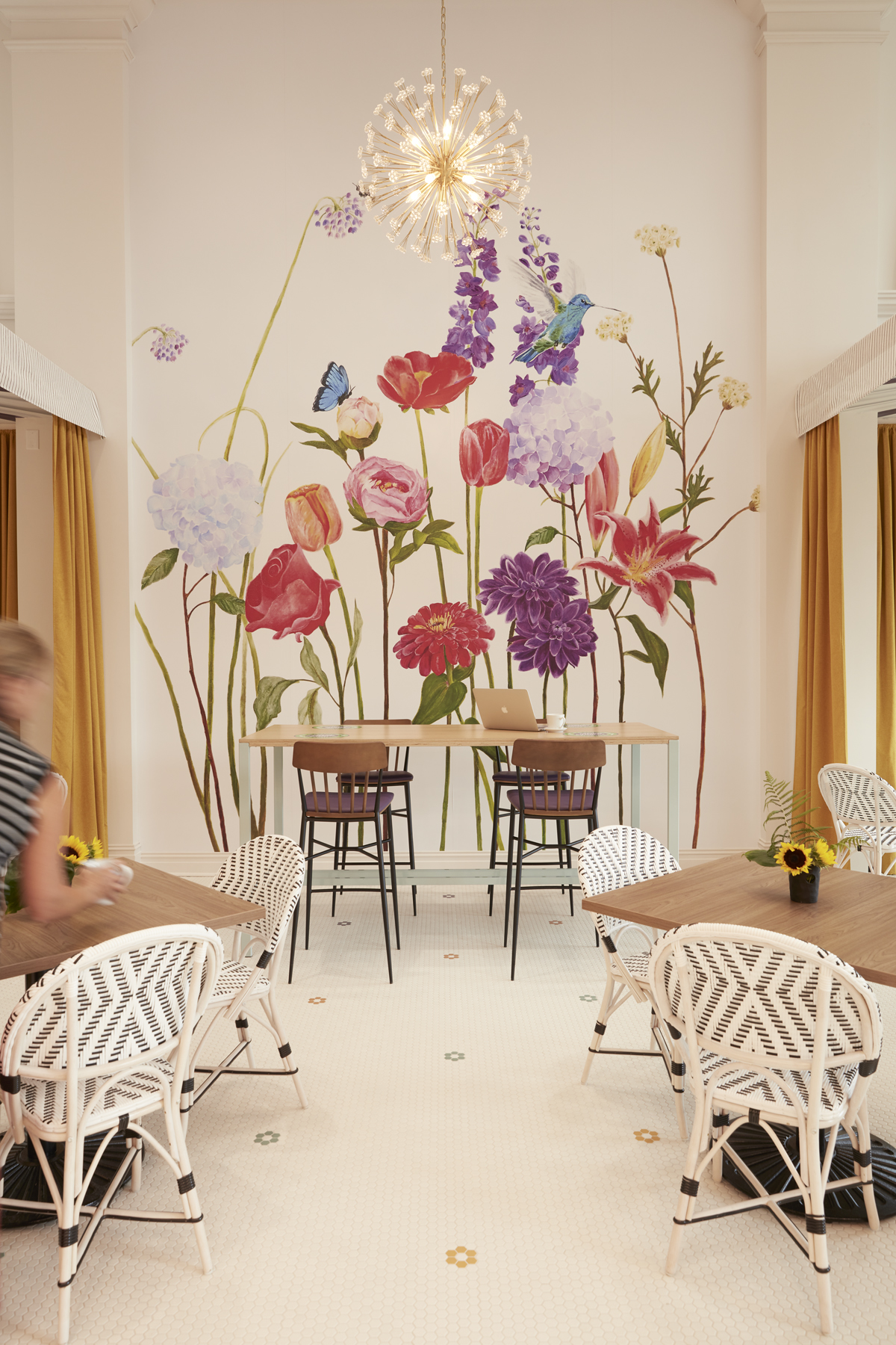 Every detail within this university conservatory was crafted toward the concept of being one with nature. Celebrating the many beautiful plants and flowers within the greenhouse portion of the building, the interiors bring colors from the outdoors in. The restaurant dining is framed by large structural cabanas with hand painted ceilings. A two story wall mural sits between the cabanas, capturing the work of a local artist, playing with scale and making one feel like a small part of an active ecosystem. Striped awnings and bistro chairs transport you to an outdoor brasserie as you enjoy a lavender gelato between classes. The outdoor lounge and dining spaces embrace the vibrant colors found within the meandering gardens blending into a luscious backdrop of foliage.