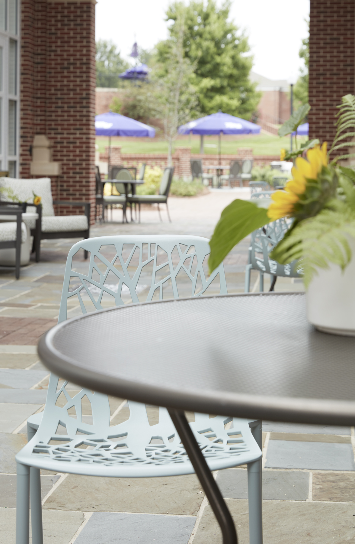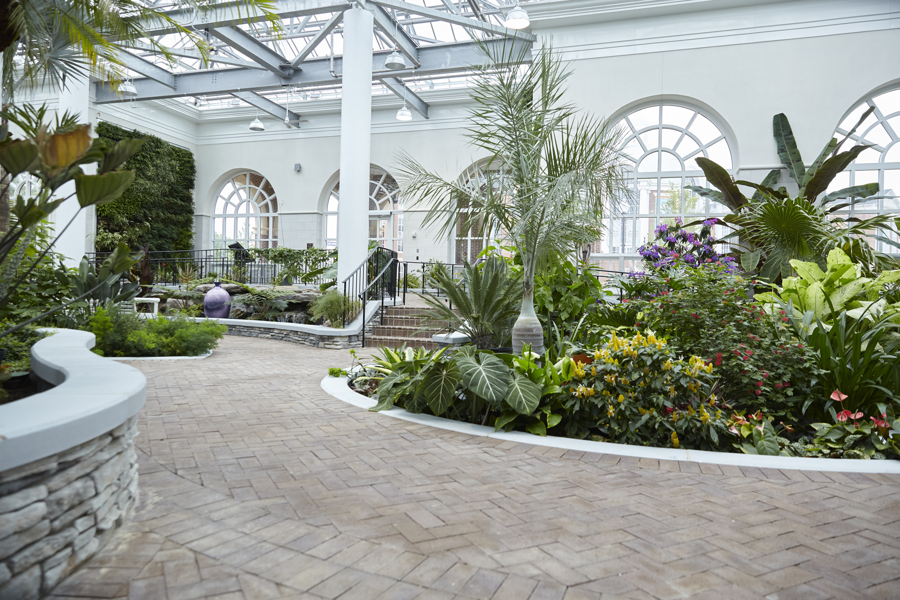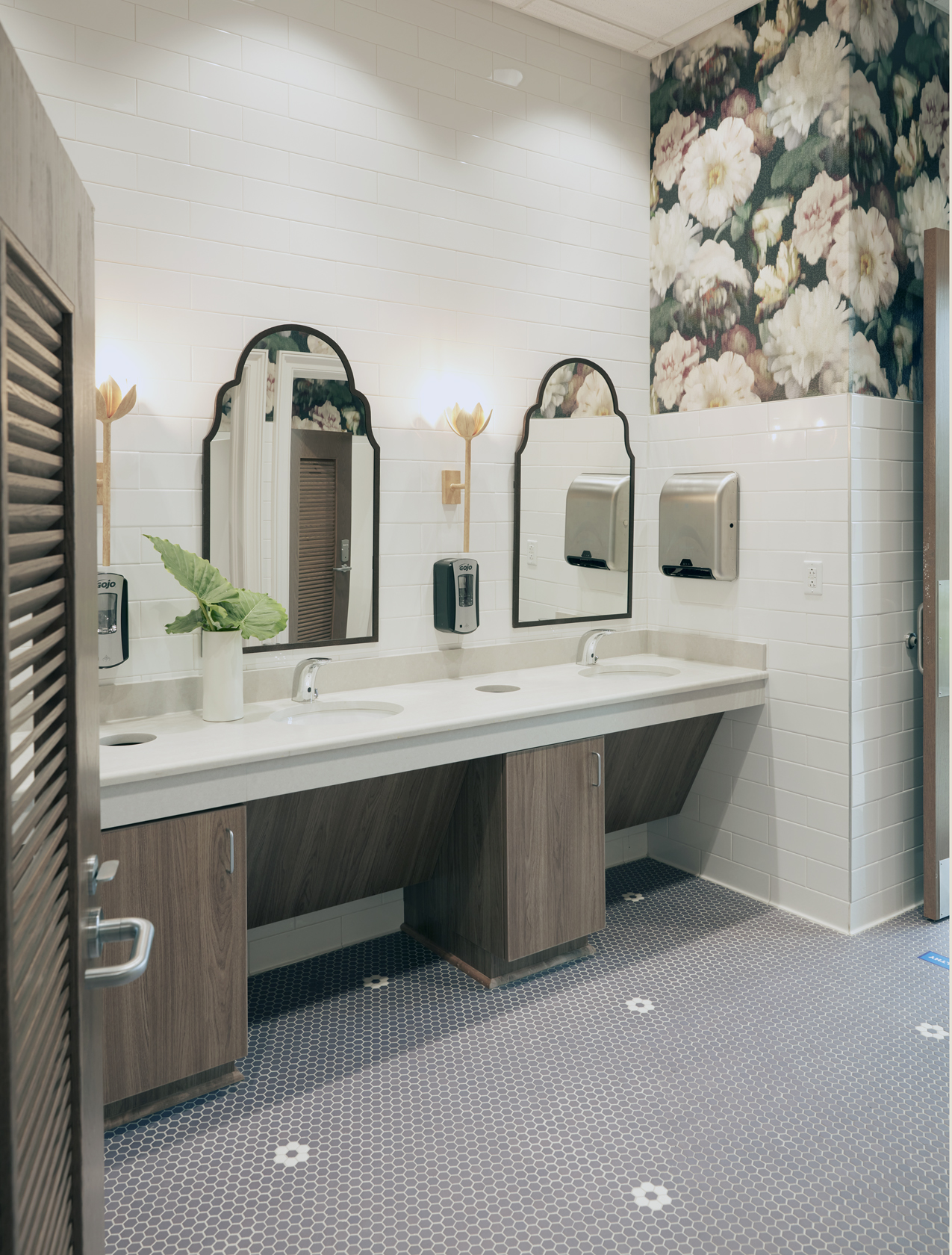 Every detail within this university conservatory was crafted toward the concept of being one with nature. Celebrating the many beautiful plants and flowers within the greenhouse portion of the building, the interiors bring colors from the outdoors in. The restaurant dining is framed by large structural cabanas with hand painted ceilings. A two story wall mural sits between the cabanas, capturing the work of a local artist, playing with scale and making one feel like a small part of an active ecosystem. Striped awnings and bistro chairs transport you to an outdoor brasserie as you enjoy a lavender gelato between classes. The outdoor lounge and dining spaces embrace the vibrant colors found within the meandering gardens blending into a luscious backdrop of foliage.