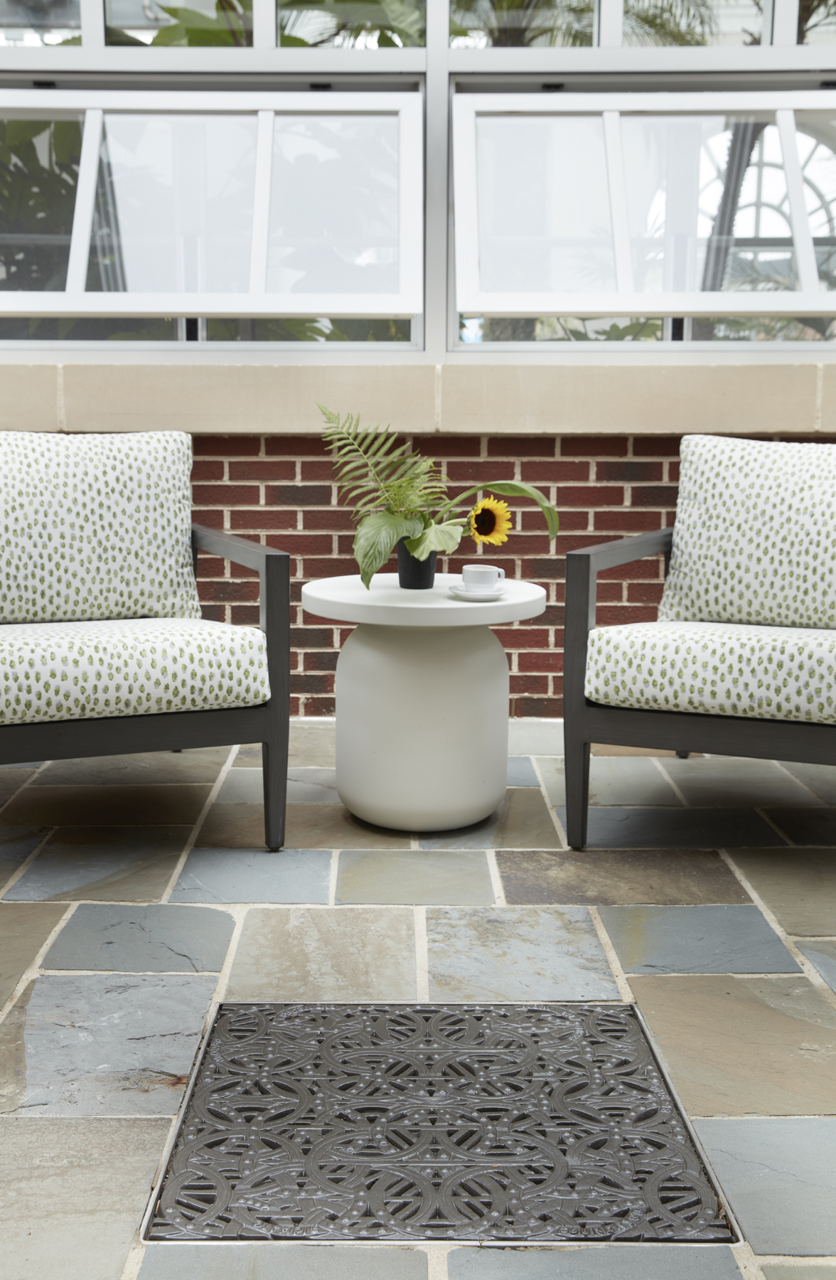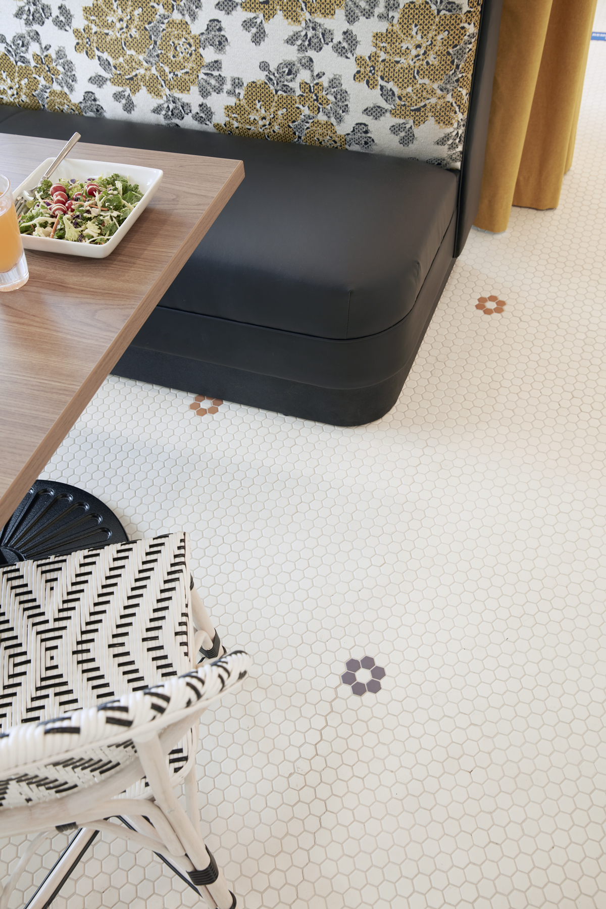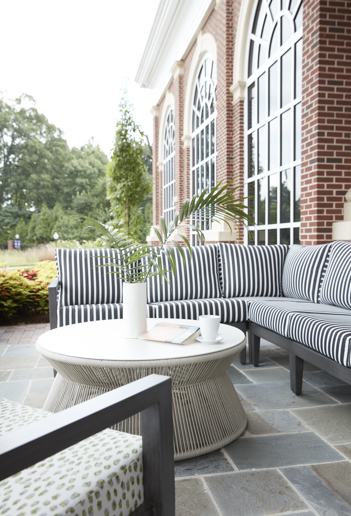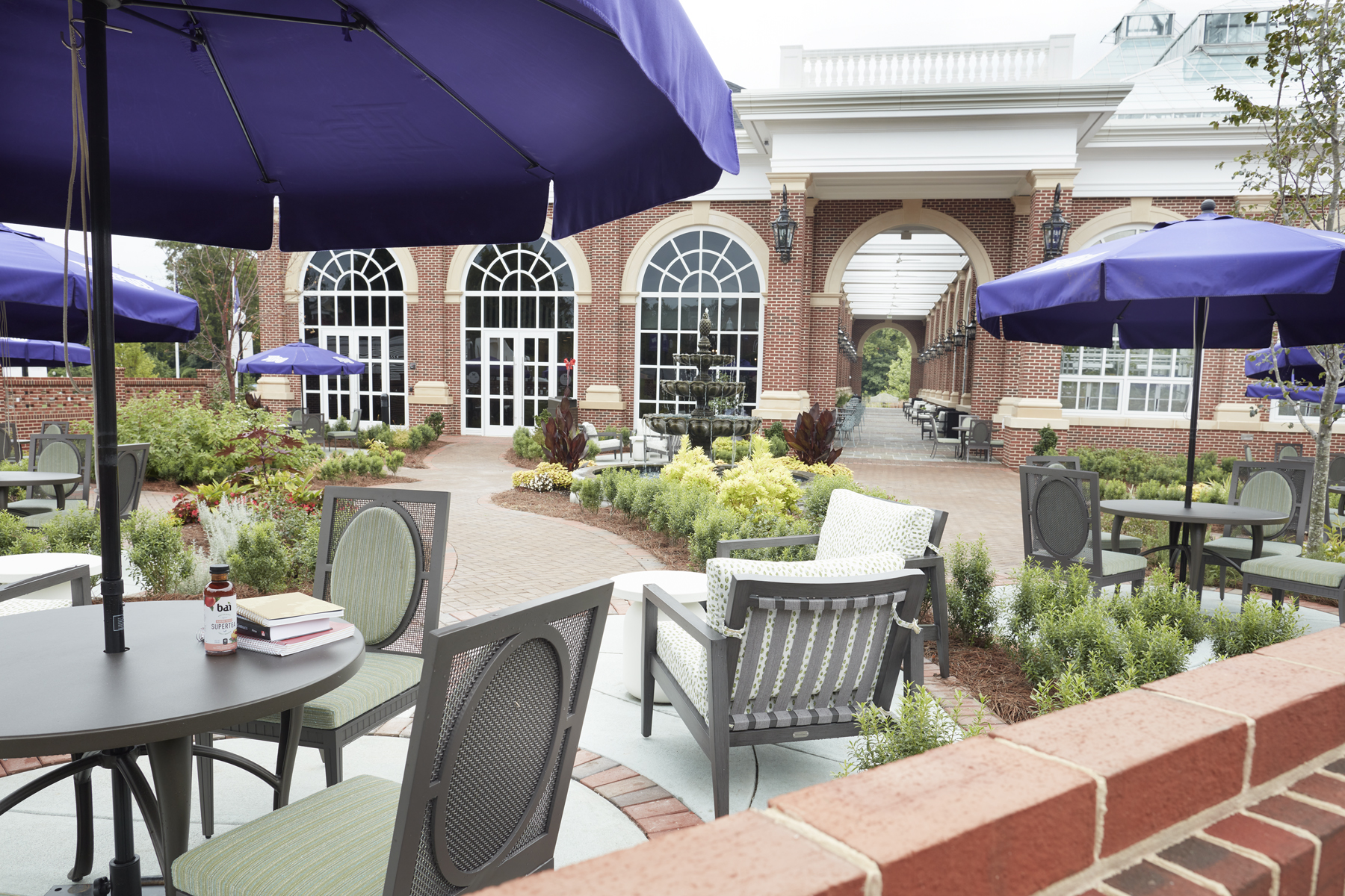Every detail within this university conservatory was crafted toward the concept of being one with nature. Celebrating the many beautiful plants and flowers within the greenhouse portion of the building, the interiors bring colors from the outdoors in. The restaurant dining is framed by large structural cabanas with hand painted ceilings. A two story wall mural sits between the cabanas, capturing the work of a local artist, playing with scale and making one feel like a small part of an active ecosystem. Striped awnings and bistro chairs transport you to an outdoor brasserie as you enjoy a lavender gelato between classes. The outdoor lounge and dining spaces embrace the vibrant colors found within the meandering gardens blending into a luscious backdrop of foliage.