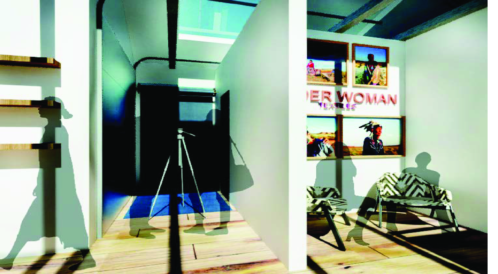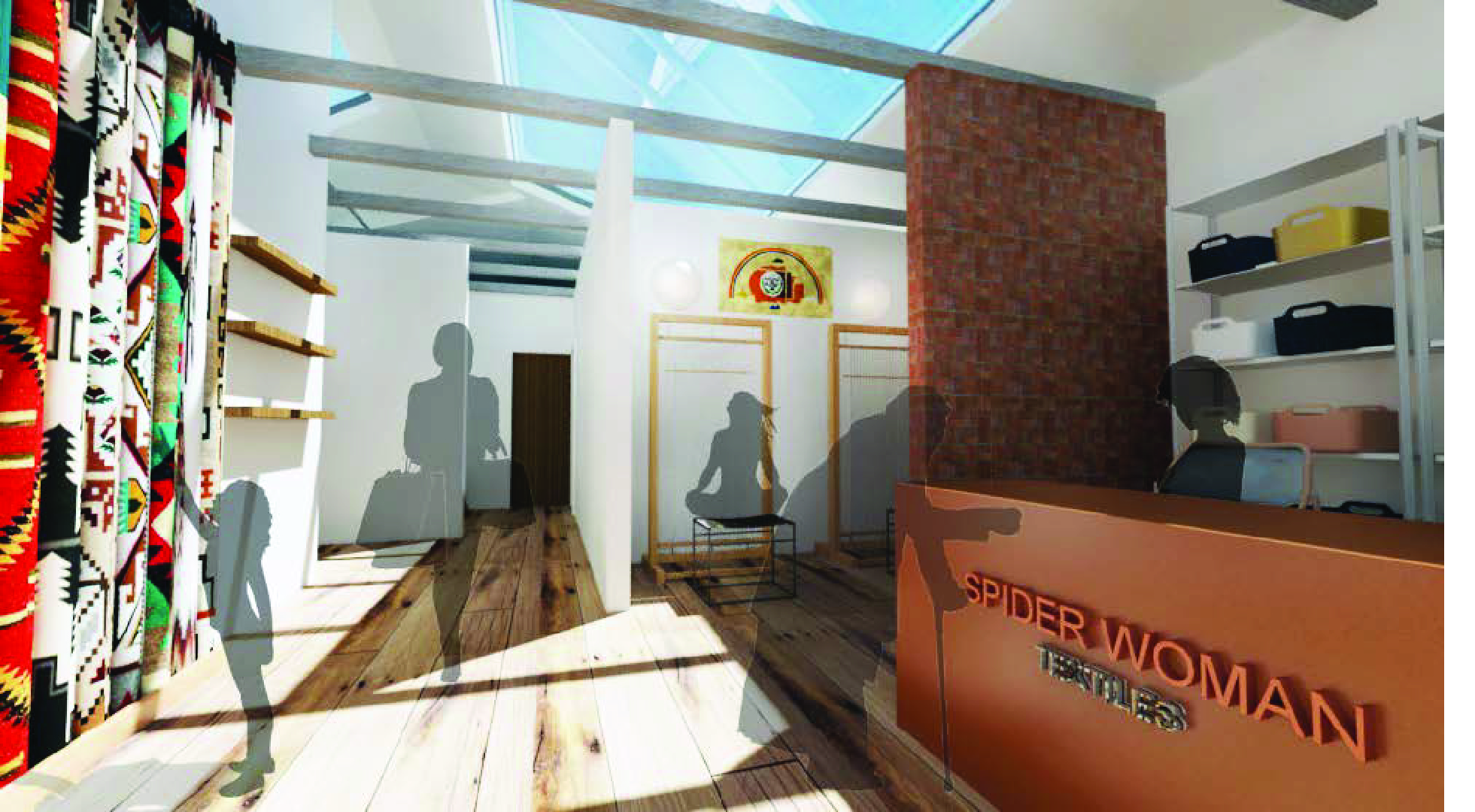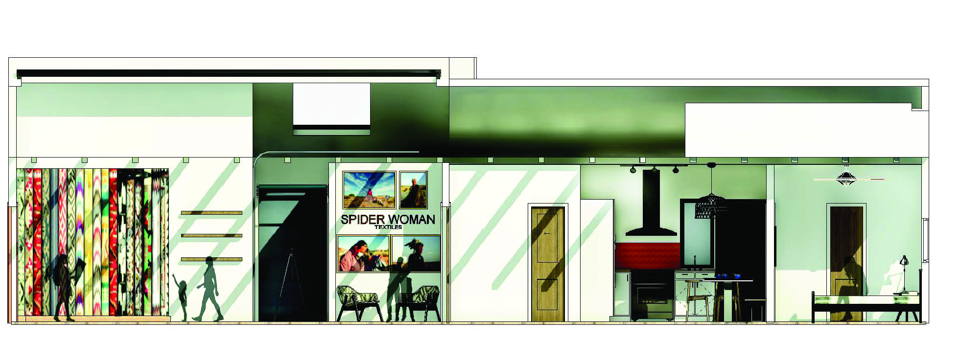 Spider Woman Textiles was designed in three shipping containers to support a Navajo couple who made textiles to sell to the community. The couple wanted to live in a sustainable way as well as wanting to keep their Navajo traditions alive. The clients not only wanted to live out of their space but also wanted to use it as a commercial space to sell and make their textiles. For our clients, my partner and I did research on the traditions and culture of the Navajo community allowing us to specify materials, and furniture to keep the traditions and culture of the Navajo community to help feel at home. The programming called for a living and workspace for the couple as well as a flex space, dining area that can seat up to ten people, and a guest bedroom and bath in addition to a master bed and bath, photography area, makerspace, showroom, Cashwrap-area and storage, all to fit comfortably in the size of three shipping containers.