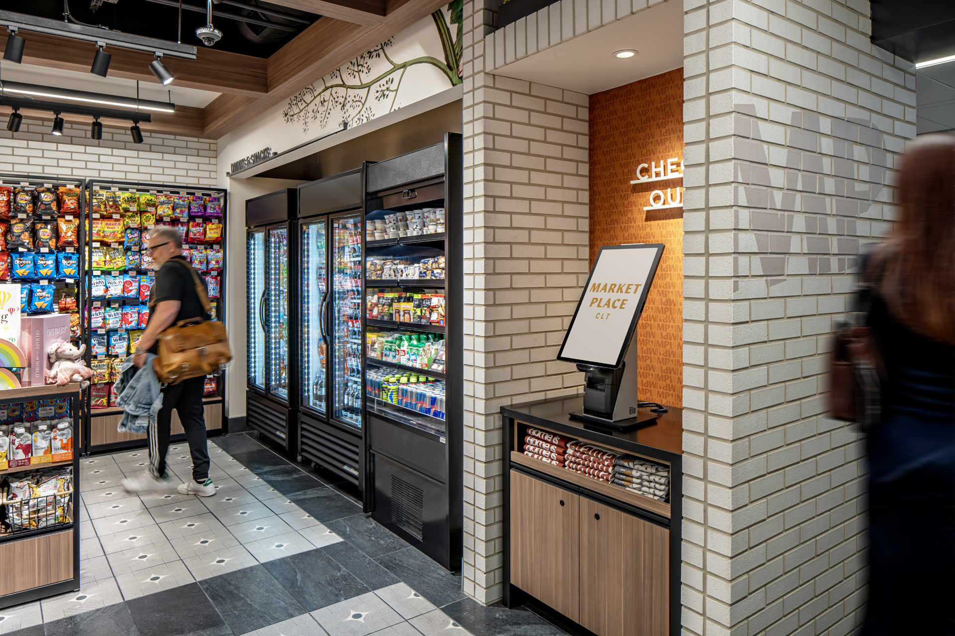 Clear graphics and self-checkout nooks support both leisurely browsing and efficient transactions, addressing the diverse rhythms of airport travelers. Premium finishes such as brick veneer and wood-look laminates add depth, while creative solutions like integrated base-building concealment demonstrate design agility.