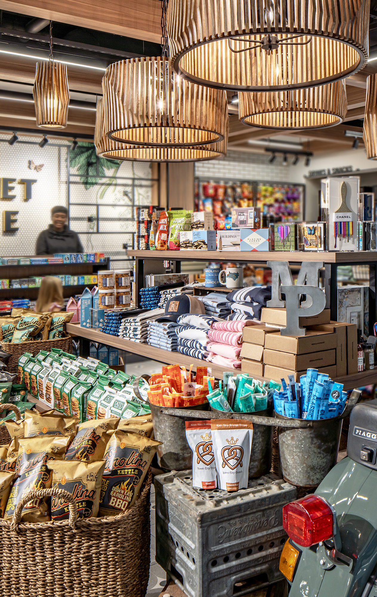 With its open, intuitive layout and warm material palette, the design welcomes travelers into a serene and stylish space. A Vespa perched near the entrance evokes wanderlust and the spirit of exploration, while handcrafted signage and finishes featuring native muscadine vines root the store in North Carolina’s identity. Biophilic elements, layered lighting, and custom millwork create a rich sensory experience that is calm yet contemporary.