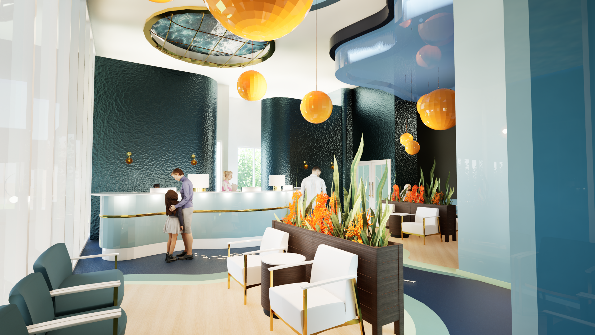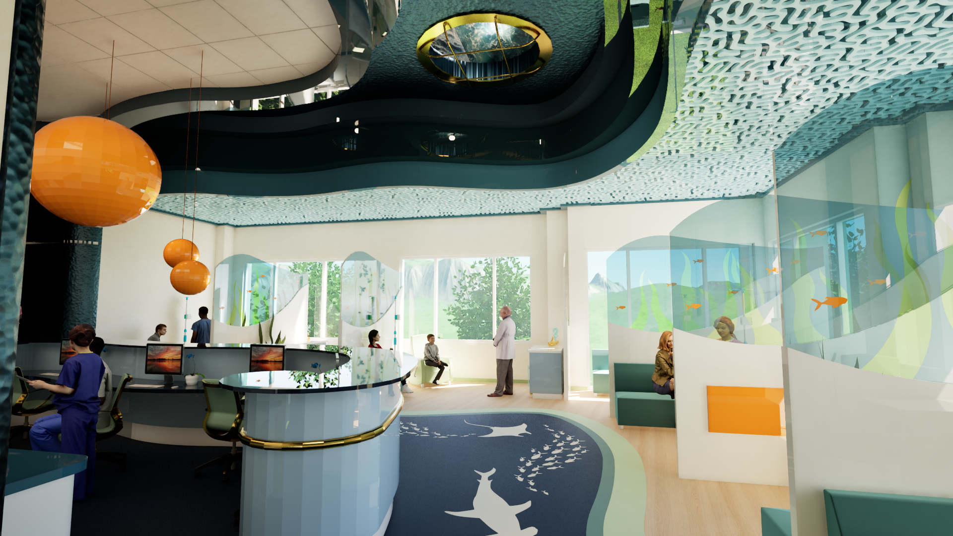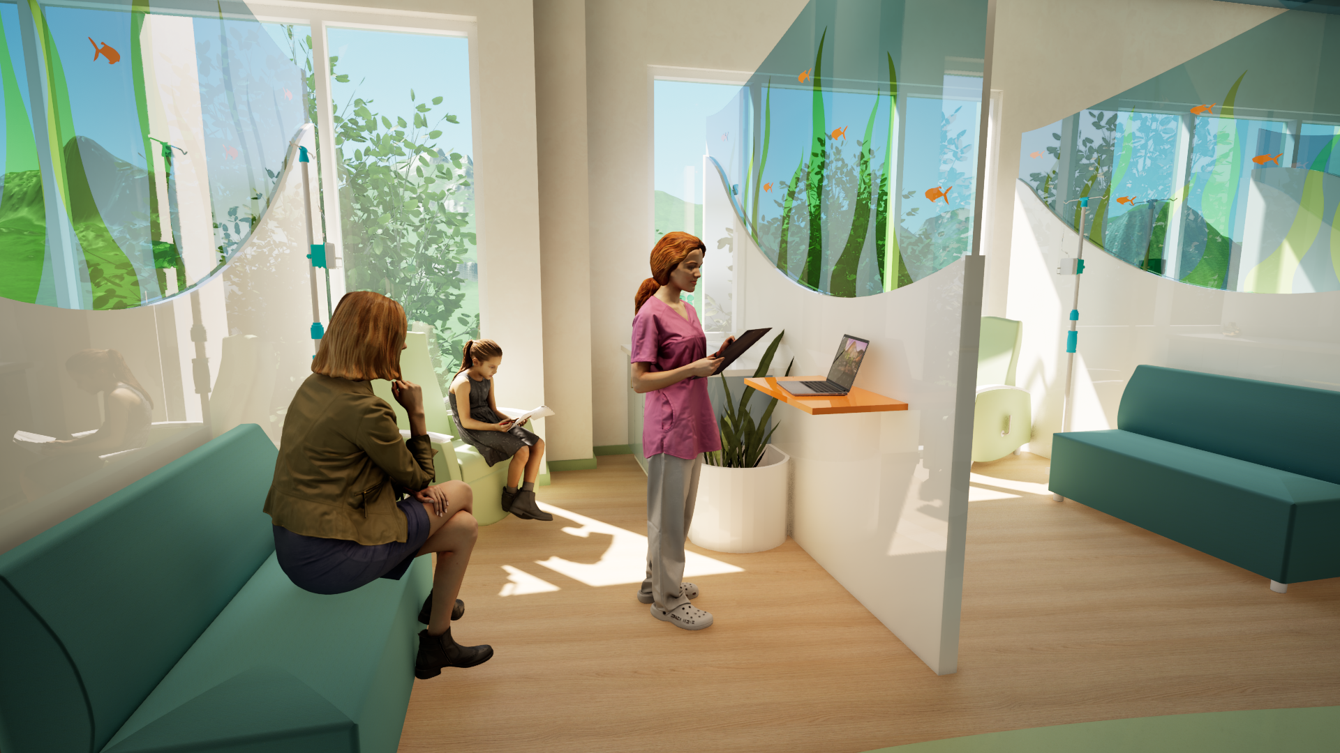 This Pediatric Infusion Center is located in Durham, NC as a part of the Duke Health System. This design creates an environment that balances the clinical requirements of a pediatric infusion center with the need for a comforting, child-friendly atmosphere. This center provides a safe, efficient, and functional medical space while ensuring it is not intimidating or overly clinical for young patients who may already feel anxious about their treatment. Additionally, this space accommodates frequent visitors, as some children come for weekly treatments, while offering flexibility for different age groups and treatment needs. Ensuring emotional well-being, providing distraction therapy, and meeting accessibility standards for both patients and families are key challenges. This design is also sustainable, durable, and compliant with healthcare regulations.